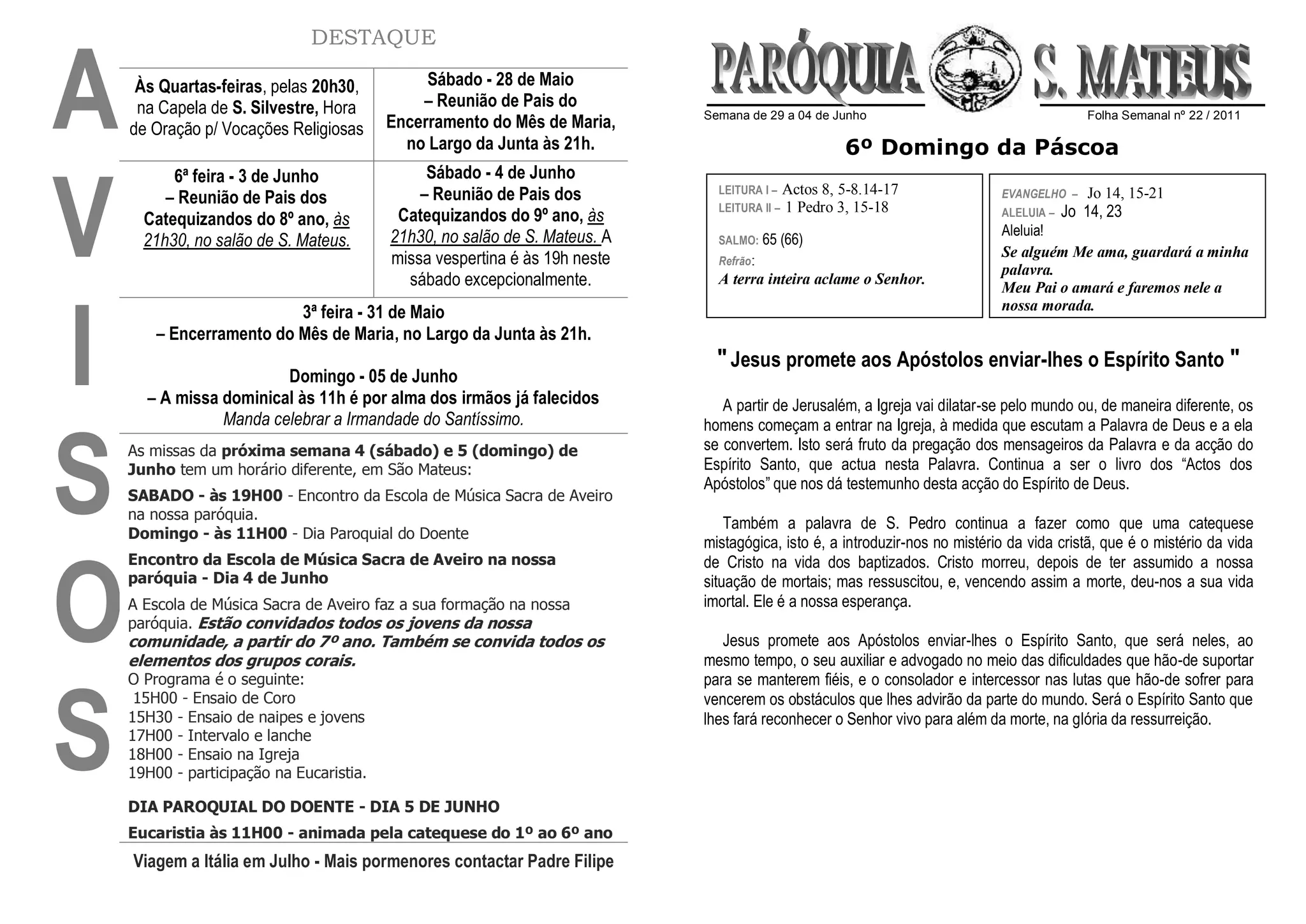 3) Mudança no horário das missas dos dias 4 e 5 de junho para acomodar um encontro musical.
