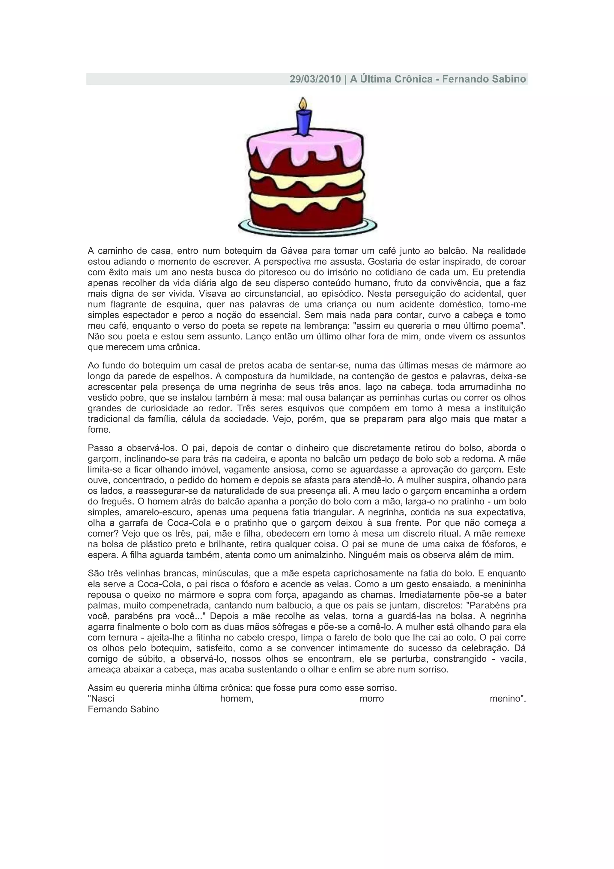 O documento descreve uma cena observada pelo autor em um botequim, onde um casal negro e sua filha de 3 anos comemoram discretamente o aniversário da menina com velas em um pedaço de bolo e parabéns. Ao ser notado pelo autor, o pai constrangido sustenta o olhar e sorri, inspirando o autor em sua última crônica.