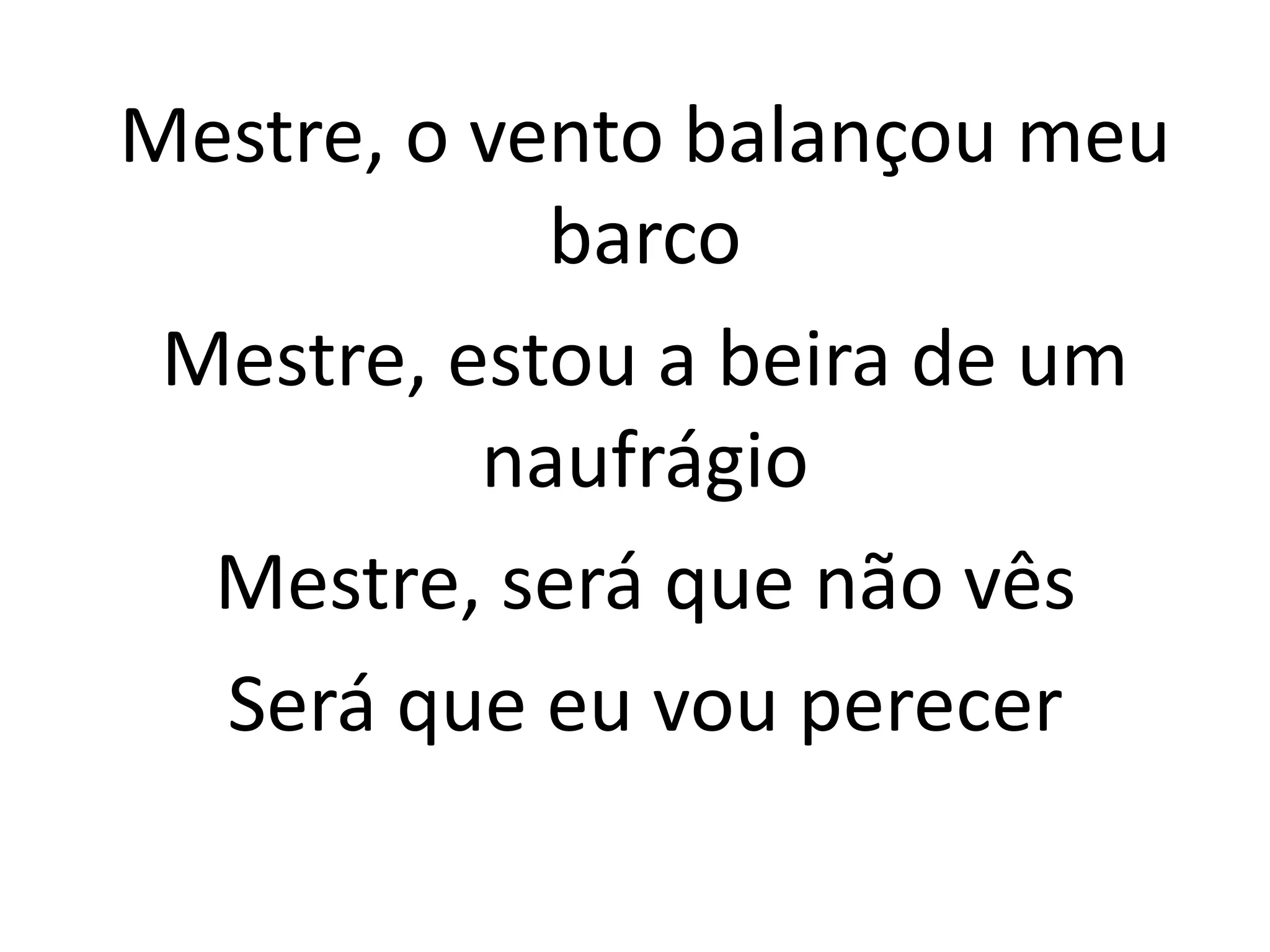 O cantor se sente à beira de um naufrágio em seu barco, com ventos fortes e ondas altas, mas tem fé que seu Mestre Jesus está com ele e virá em seu socorro, pois tem poder sobre o mar e o vento. Apesar das dificuldades, o cantor crê que amanhã será melhor e que não naufragará por conta da presença de Jesus.