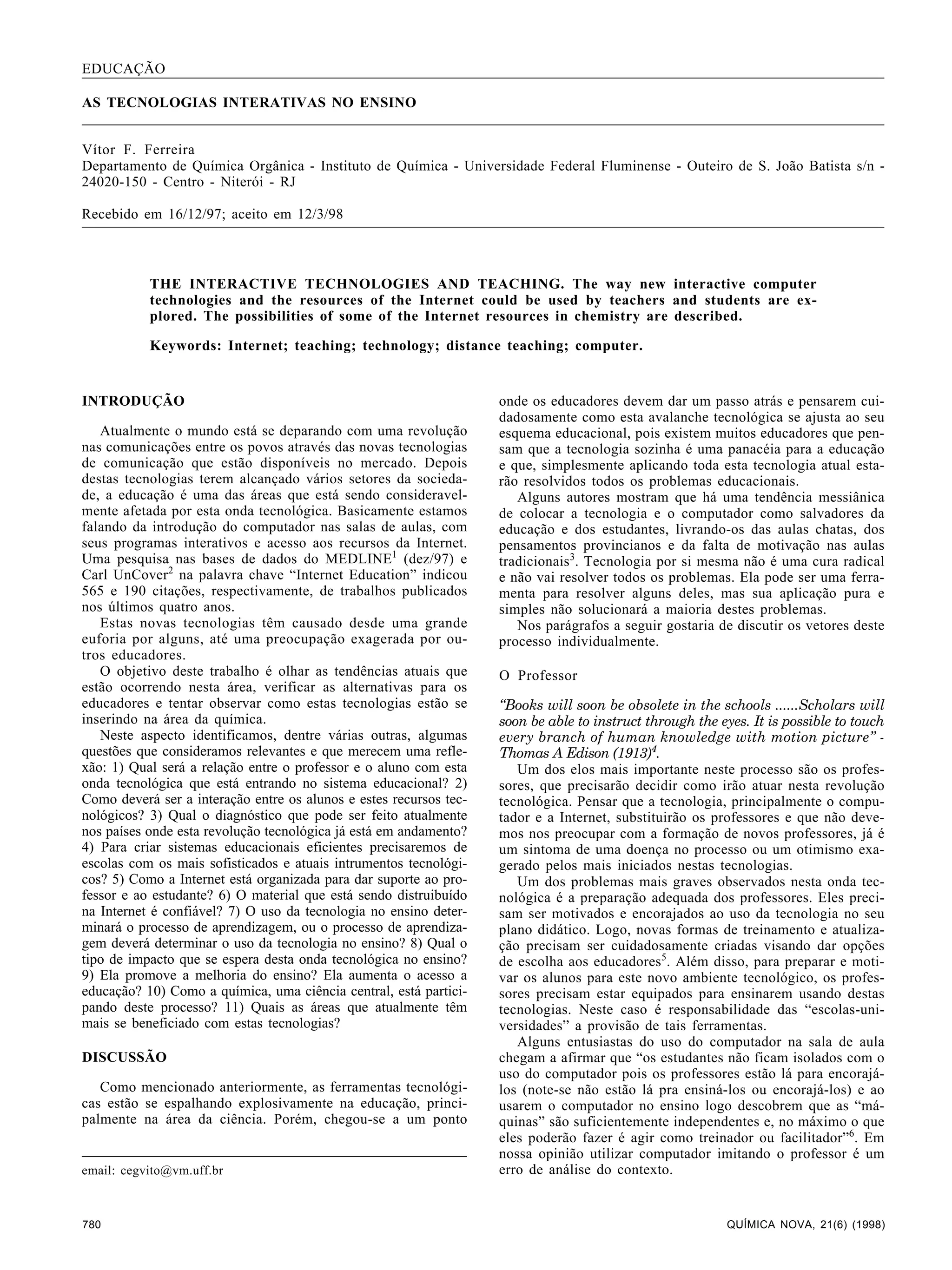 Este documento discute as tecnologias interativas no ensino e como elas podem ser usadas por professores e alunos. O autor explora como recursos da internet podem ser usados no ensino de química e descreve algumas possibilidades. Também discute como os professores devem se adaptar a esta revolução tecnológica e como as novas tecnologias podem melhorar o ensino se usadas corretamente.