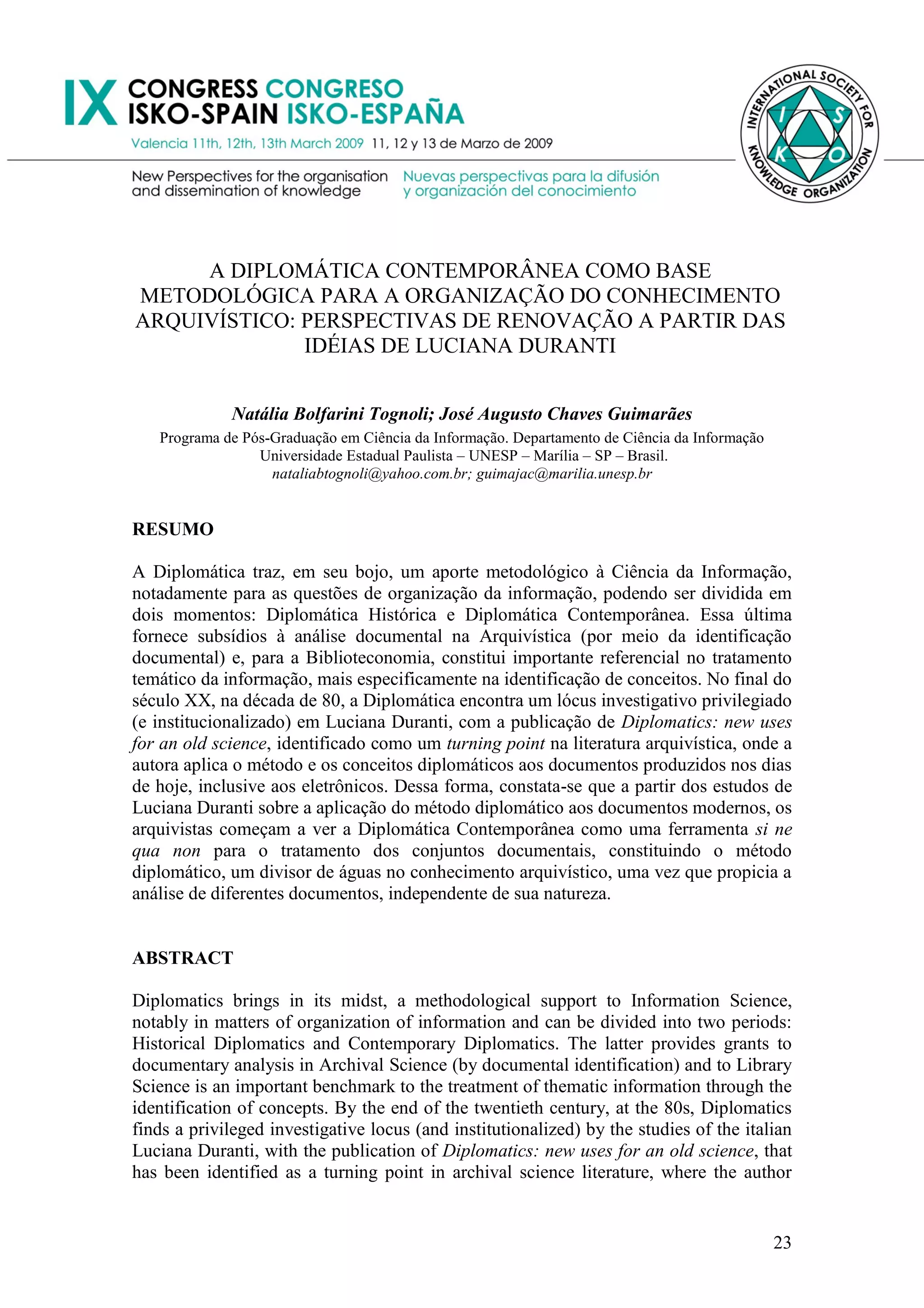 O documento discute a Diplomática Contemporânea como base metodológica para organização do conhecimento arquivístico. Apresenta Luciana Duranti como figura central que aplicou o método diplomático aos documentos modernos, mostrando que os mesmos elementos estão presentes. Isso levou os arquivistas a verem a Diplomática Contemporânea como ferramenta essencial para tratamento de conjuntos documentais no século 21.