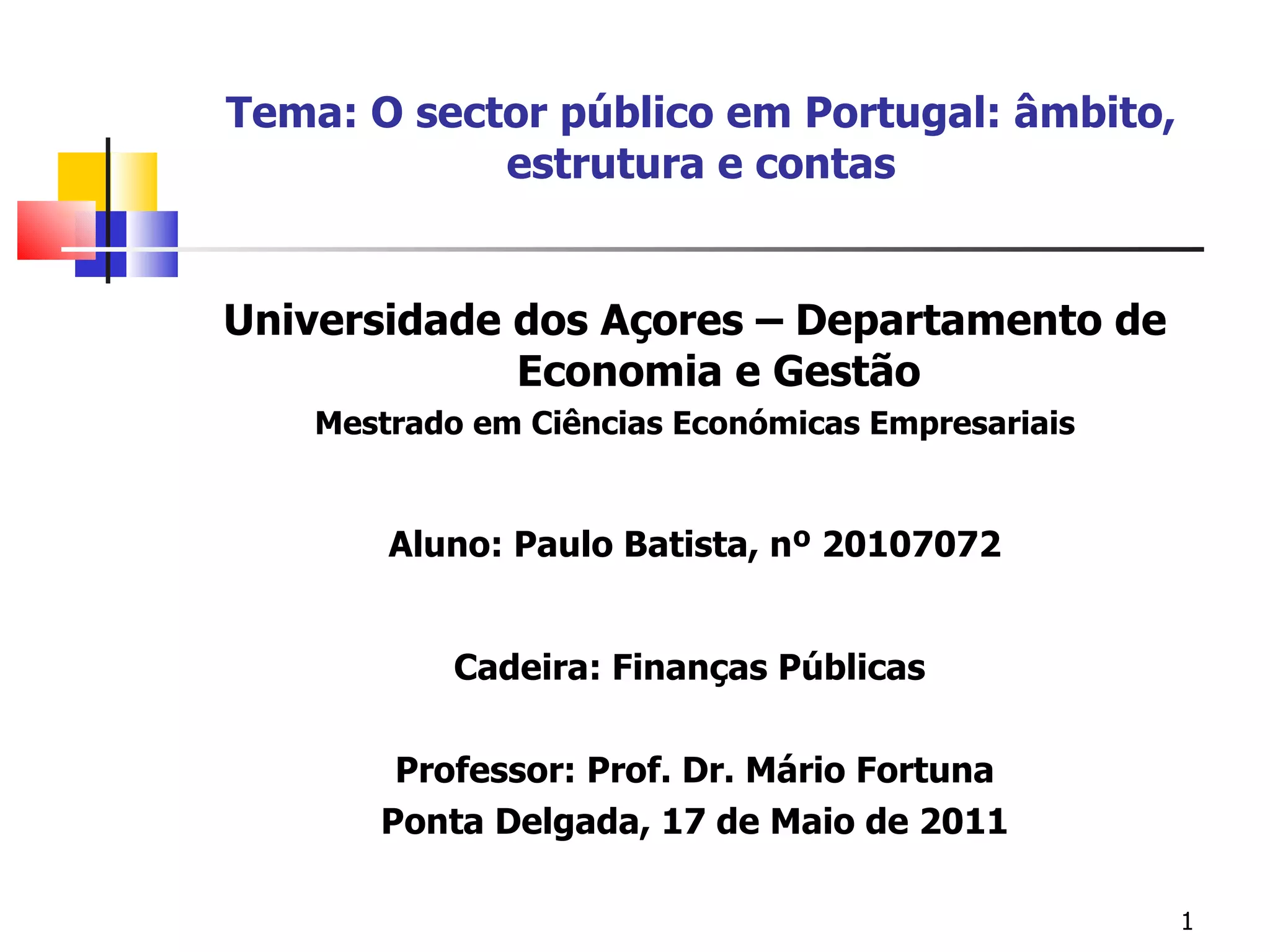 O documento discute o âmbito, estrutura e contas do sector público em Portugal. Descreve que o sector público inclui as administrações públicas (AP) e o sector público empresarial. As AP incluem a administração central, regional e local e a segurança social, que fornecem bens e serviços não mercantis financiados por impostos. A administração central inclui o estado e os fundos e serviços autónomos.