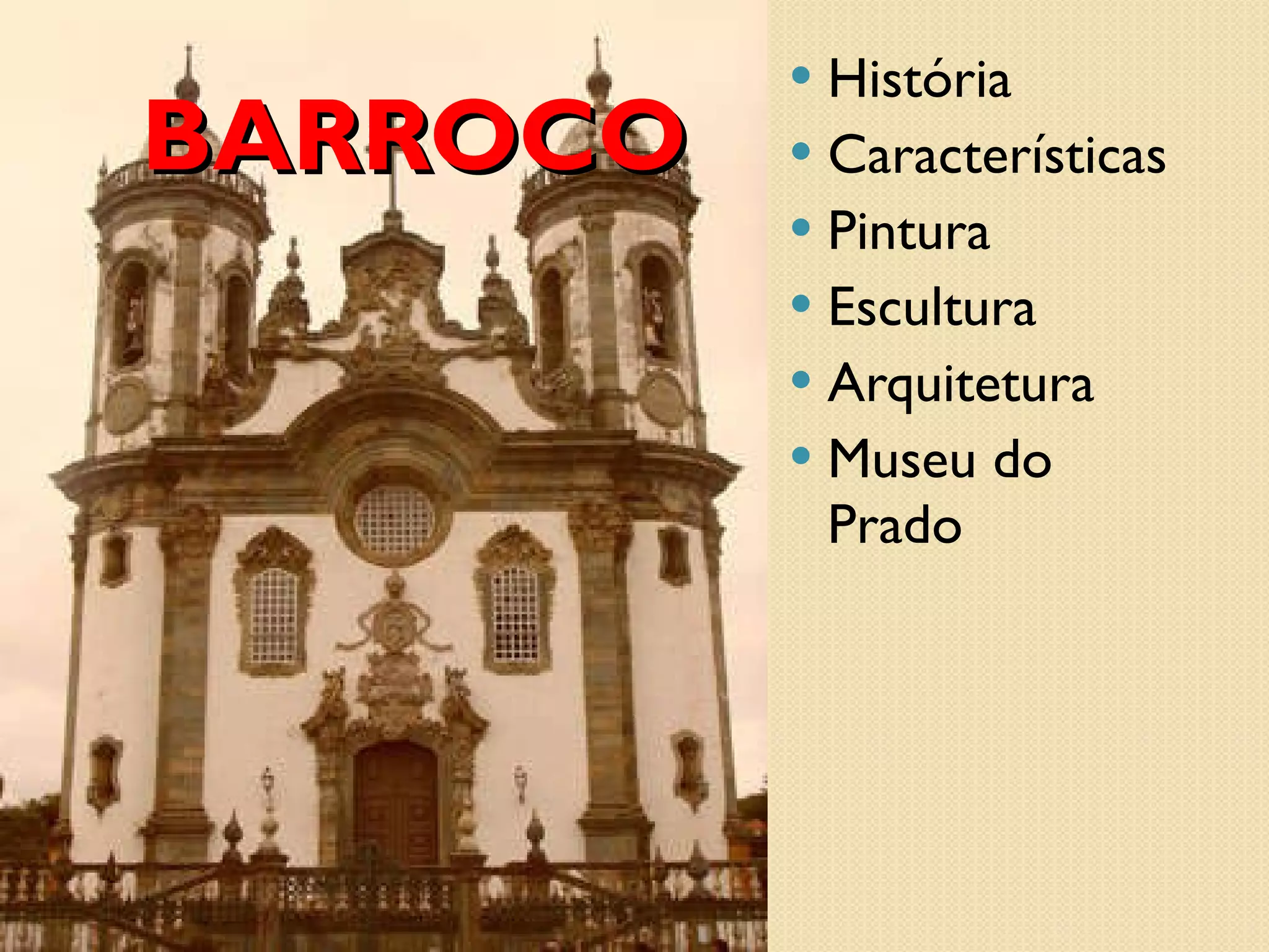 O documento descreve a história e as características do estilo Barroco na arte, arquitetura e pintura. Começou na Itália no século XVII e se espalhou para outros países da Europa e Américas. Artistas como Rubens, Bernini e Velázquez foram importantes representantes. No Brasil, Aleijadinho foi um mestre do Barroco tardio em Minas Gerais. O Museu do Prado em Madri abriga uma significativa coleção de obras Barrocas.