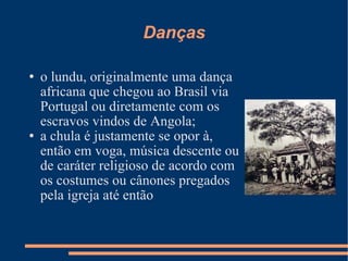 O documento descreve a música popular brasileira dos séculos XVII-XVIII, incluindo danças como o lundu e a modinha. A modinha era uma canção lírica sentimental derivada da moda portuguesa. O criador da modinha foi Domingos Caldas Barbosa, um mulato brasileiro que viveu em Portugal no século XVIII.