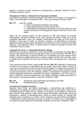 O documento discute as principais teorias sobre a demanda por moeda, começando pela versão clássica baseada na teoria quantitativa da moeda. Apresenta a equação de Fisher (MV=PT) e sua evolução para a equação de trocas (MV=PY) e a velocidade-renda da moeda (V=PY/M). Discute também a abordagem de Cambridge (Md=kPY) e o exemplo ilustrativo dos encaixes mínimos de indivíduos e empresas ao longo do tempo.