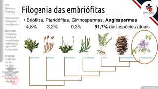 O documento discute a evolução das plantas terrestres, comparando gimnospermas e angiospermas. As gimnospermas incluem coníferas, gnetos, cicas e ginkgos, e se reproduzem por meio de estróbilos produzindo esporos. As angiospermas evoluíram para produzir flores e frutos, permitindo a polinização e reprodução independente da água. Isto levou à conquista do ambiente terrestre.