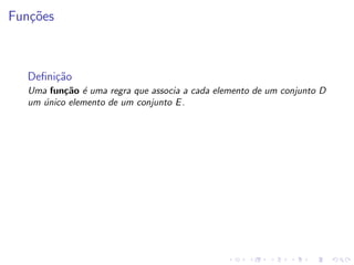 O documento descreve uma aula sobre funções matemáticas. Ele define funções, explica seus componentes (domínio e contradomínio) e fornece exemplos de diferentes tipos de funções, incluindo funções geradas por dados experimentais, modelos matemáticos, expressões polinomiais e outras. Além disso, discute como manipular funções através de deslocamentos, reflexões e expansões/contrações de seus gráficos.