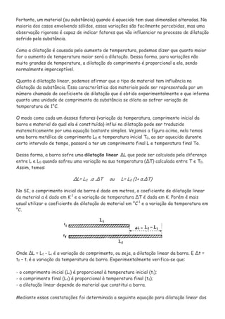 O documento discute os conceitos de dilatação térmica, explicando que quando a temperatura de um sólido aumenta, suas moléculas se agitam mais fazendo com que ele aumente de tamanho. Também fala sobre dilatação linear e como diferentes materiais se dilatam em quantidades diferentes quando aquecidos, medido pelo coeficiente de dilatação. Por fim, explica o funcionamento da lâmina bimetálica.