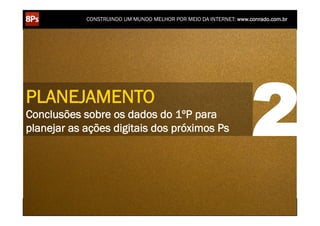 O documento discute o planejamento de ações digitais ao longo de 8 fases: pesquisa, planejamento, produção, publicação, promoção, propagação, personalização e precisão. Ele também apresenta um modelo de funil de vendas online e taxas típicas de conversão ao longo das etapas.