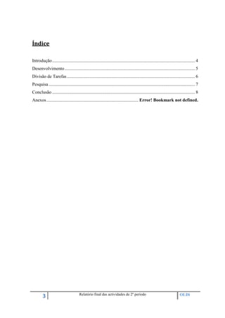Este relatório descreve as atividades de um grupo de estudantes no 2o período letivo para o seu projeto de Área de Projeto. Eles visitaram um lar local para idosos para pesquisar mais sobre as necessidades dos idosos. Após ultrapassar algumas dificuldades iniciais, o grupo dividiu as tarefas e continuou a desenvolver o plano de negócios para um serviço de recreação para idosos. Eles completaram a pesquisa necessária e concluíram que o projeto tem potencial para ser um sucesso.