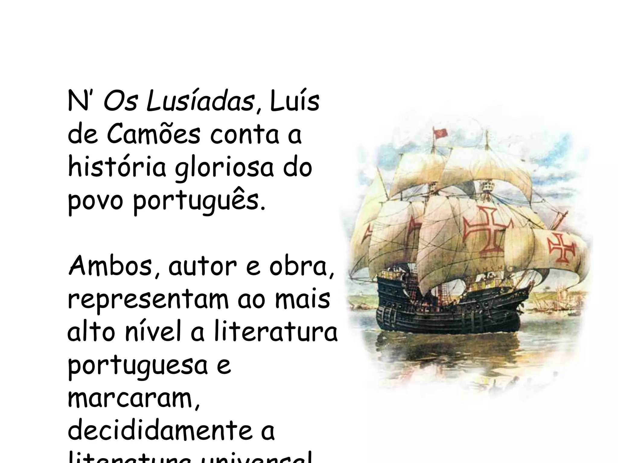 O documento descreve o contexto histórico e literário no qual Luís de Camões escreveu sua famosa epopeia Os Lusíadas. O século XVI foi marcado por grandes mudanças socioculturais na Europa, com o Renascimento, Humanismo e Classicismo questionando ideias medievais. Camões representa esses movimentos ao glorificar as conquistas portuguesas seguindo modelos clássicos.