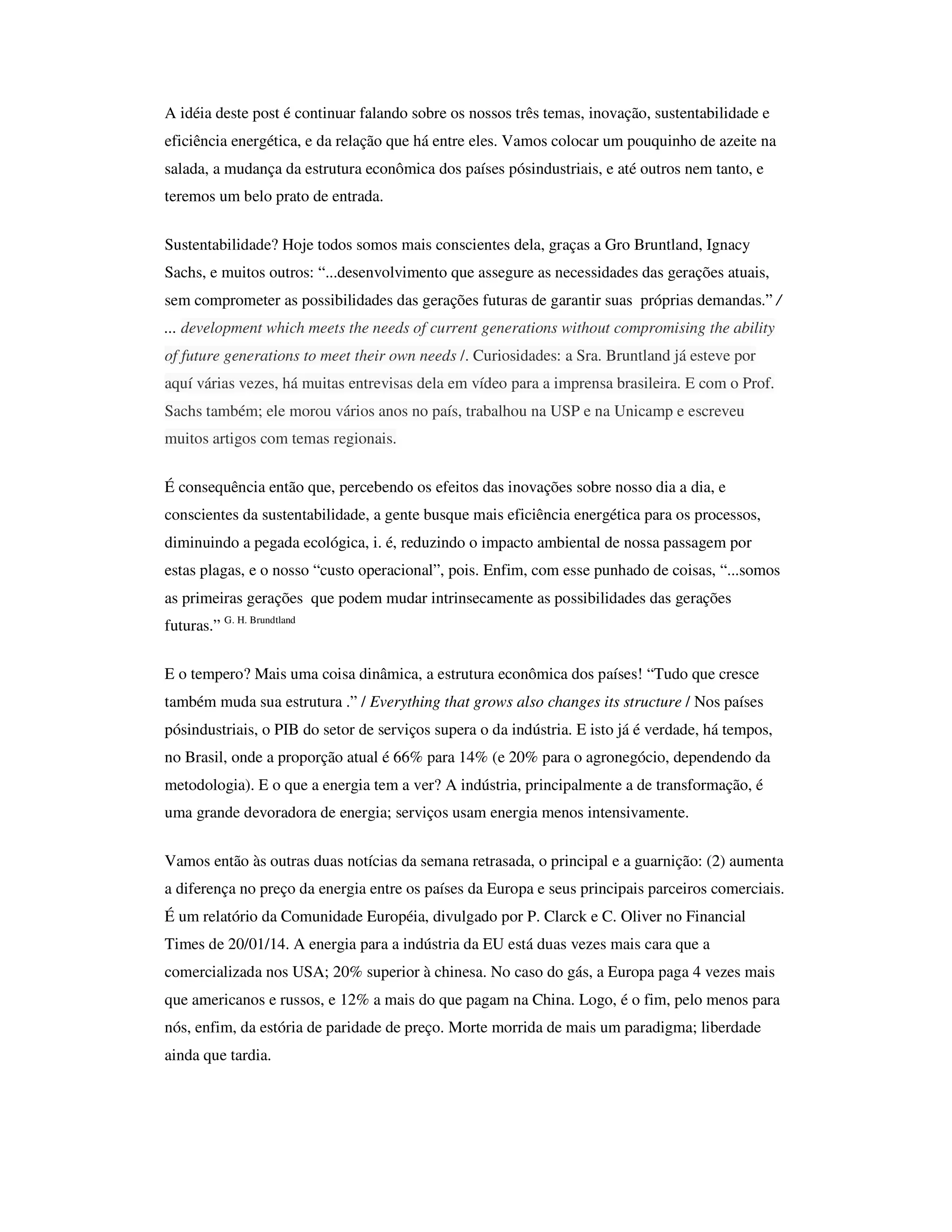 O documento discute a relação entre inovação, sustentabilidade e eficiência energética. Também analisa como a estrutura econômica muda conforme países se tornam pós-industriais, com serviços superando a indústria no PIB. A eficiência energética é importante para reduzir impactos ambientais e custos. As mudanças radicais no setor energético irão alterar a geopolítica com novos atores como EUA e Brasil se tornando exportadores.