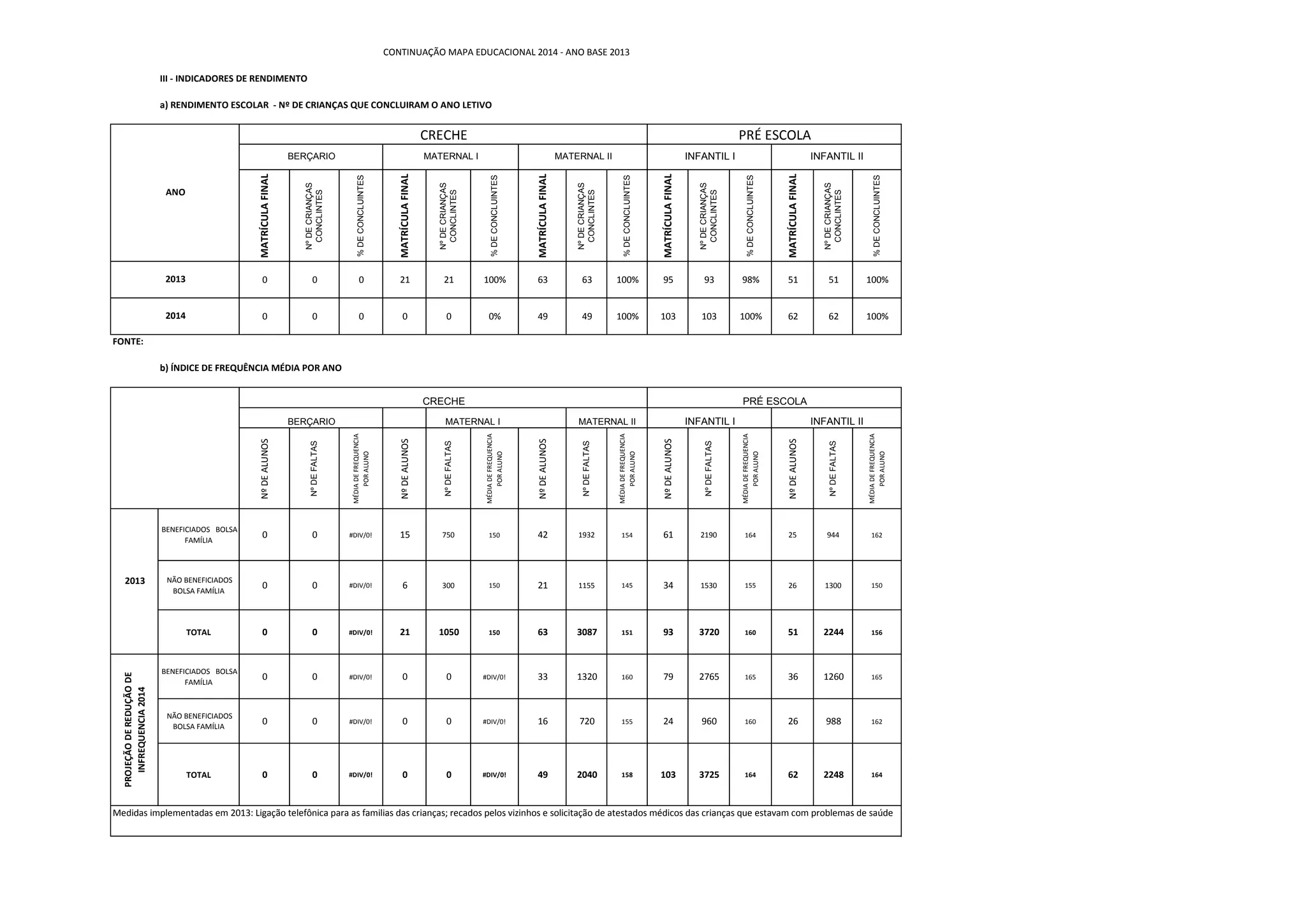 O documento apresenta indicadores de rendimento educacional e índices de frequência de uma creche entre 2013-2014, incluindo: