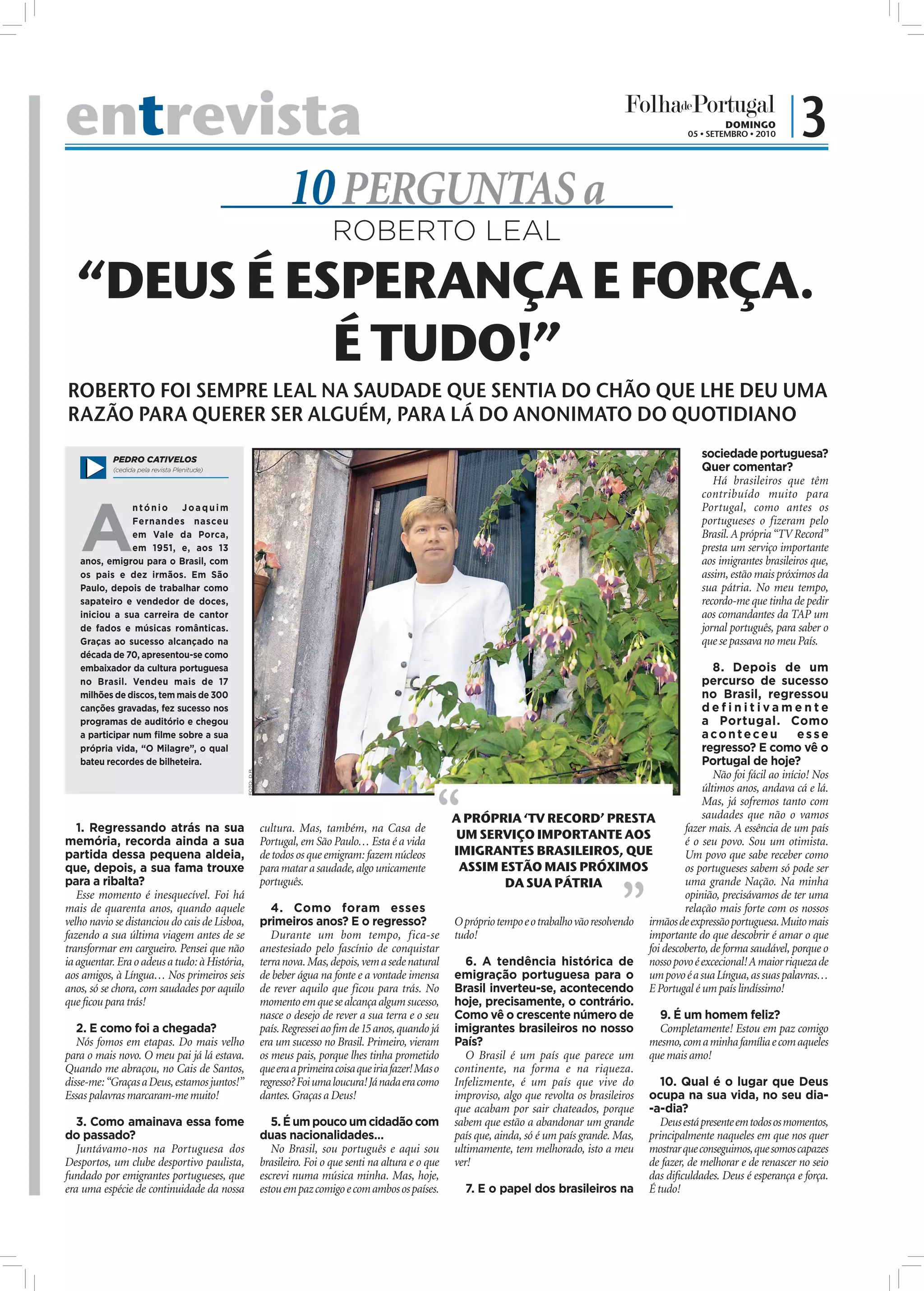 A entrevista resume a vida e carreira de Roberto Leal, um cantor português que emigrou para o Brasil aos 13 anos. Ele teve sucesso no Brasil como cantor de fados e músicas românticas, vendendo mais de 17 milhões de discos. Depois de anos de sucesso no Brasil, ele decidiu regressar definitivamente a Portugal, onde vê o futuro do país de forma otimista. Ele se considera um cidadão com dupla nacionalidade portuguesa e brasileira, mas hoje em dia se sente em paz com os dois países.