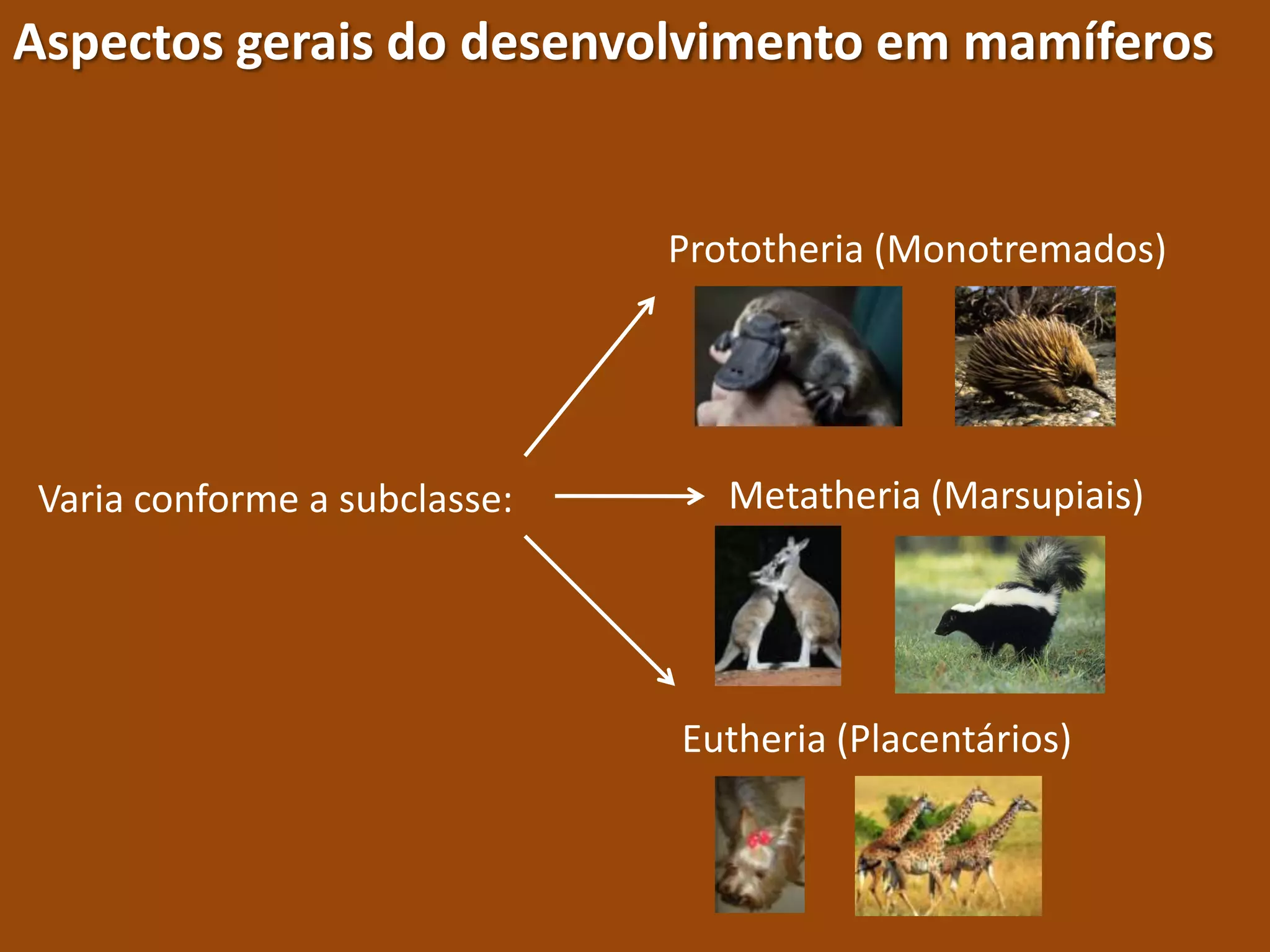 O documento descreve as principais características do desenvolvimento embrionário nos três grandes grupos de mamíferos: Prototheria (monotremados), Metatheria (marsupiais) e Eutheria (placentários). Os placentários se diferenciam por terem ovos sem vitelo, segmentação holoblástica igual e desenvolvimento completo dentro da placenta no útero.