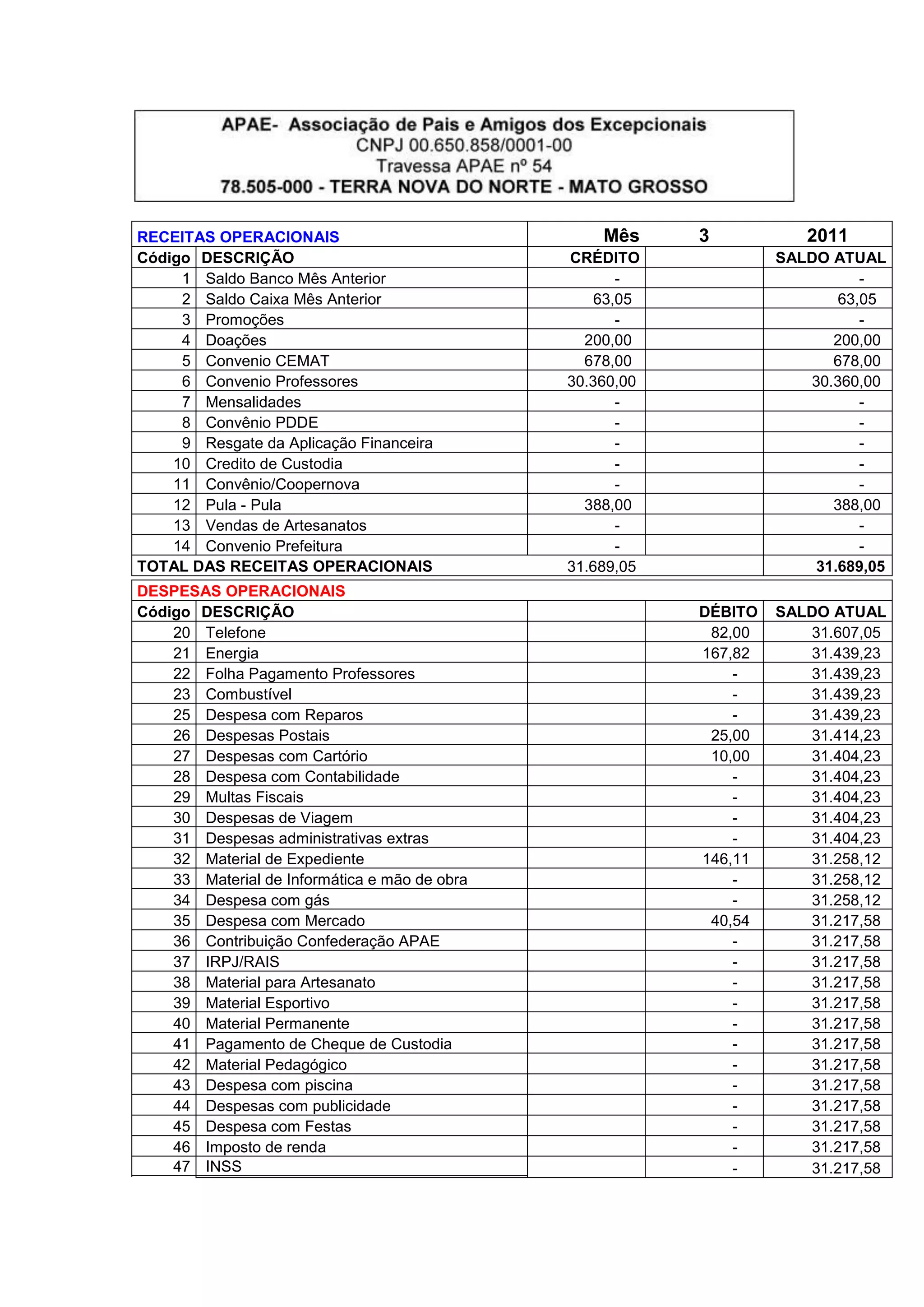 O documento apresenta as receitas e despesas operacionais da APAE de Terra Nova do Norte no mês de 2011. As receitas somaram R$31.689,05, provenientes principalmente de convênios com o CEMAT e professores. Já as despesas totalizaram R$971,47, sendo os principais gastos com telefone, energia, material de expediente e prestação de serviço. Ao final do mês a APAE apresentou um saldo de R$29.746,11.