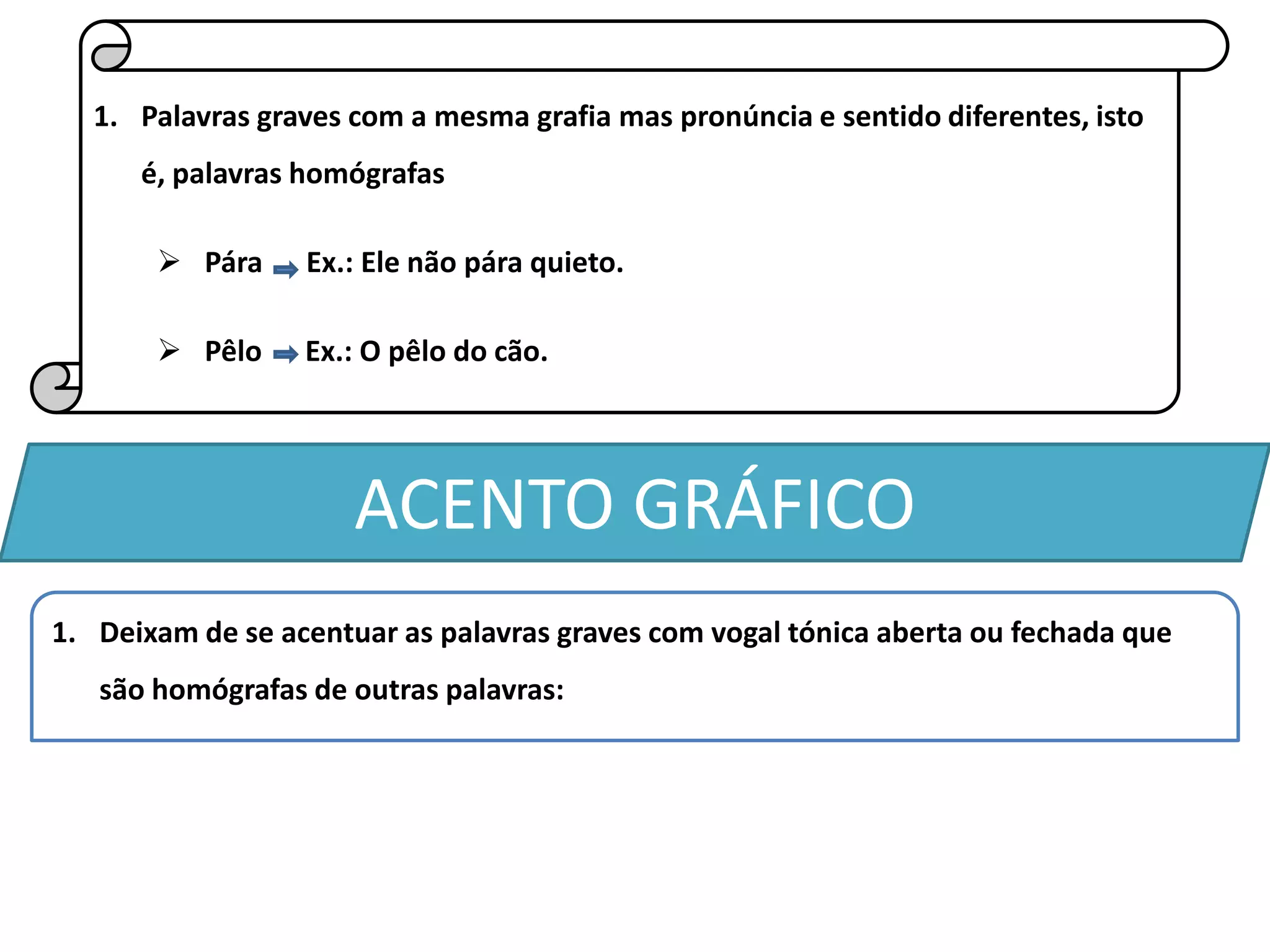 O documento discute as regras ortográficas para o uso do acento gráfico em palavras graves em português. Ele lista exemplos de palavras como "para", "pela", "pelo" que podem ou não receber acento gráfico dependendo de sua pronúncia e significado. Algumas formas verbais como a 1a pessoa do plural do pretérito também podem ou não ser acentuadas.