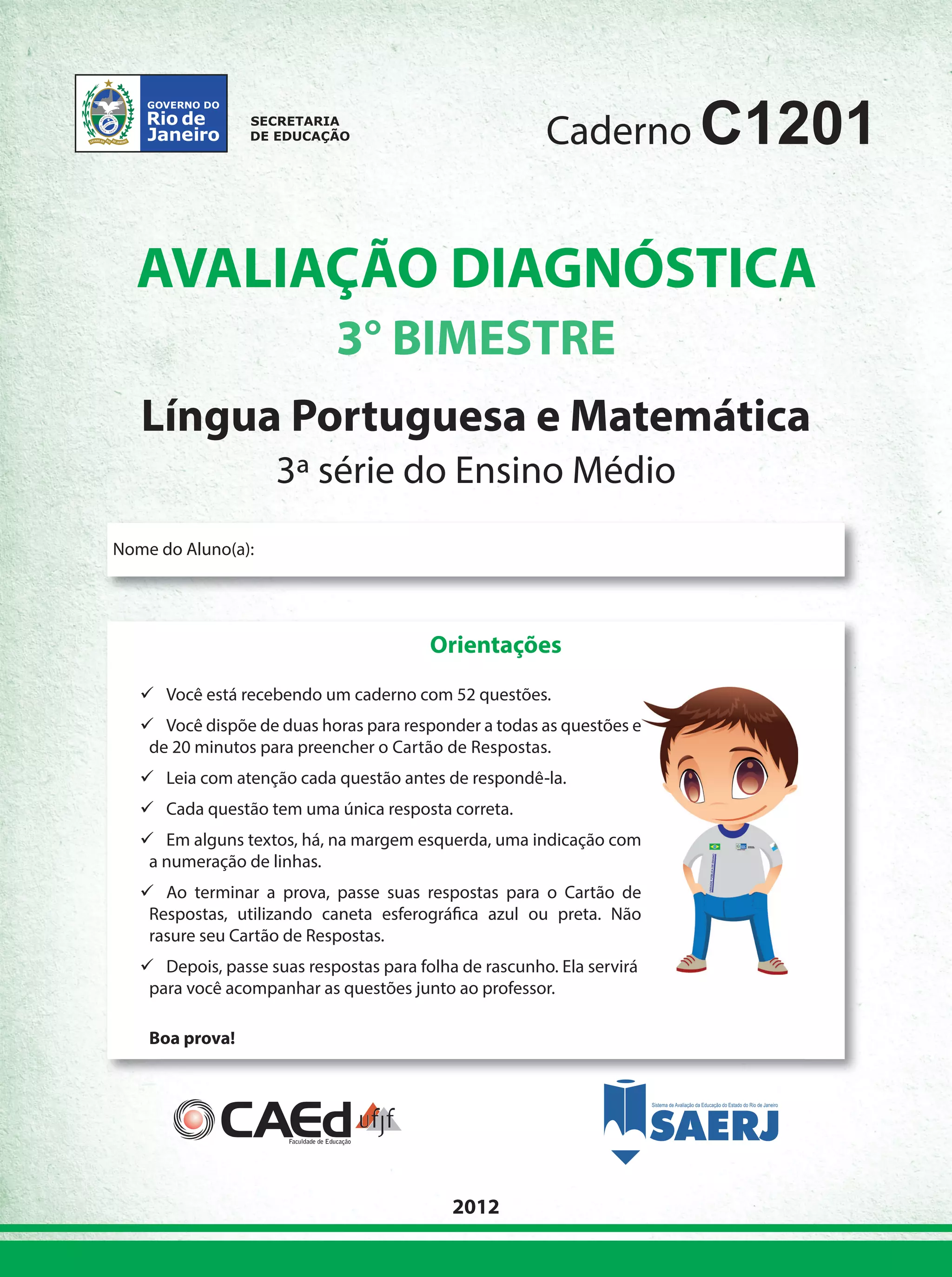 O documento apresenta instruções para a realização de uma prova de avaliação diagnóstica do 3o bimestre nas disciplinas de Língua Portuguesa e Matemática para alunos do 3o ano do Ensino Médio. O caderno contém 52 questões e o aluno tem 2 horas para respondê-las, além de 20 minutos para preencher o cartão de respostas. As instruções orientam o aluno a ler com atenção cada questão antes de respondê-la e a passar as respostas para o cartão-resposta e para uma folha de rascunho