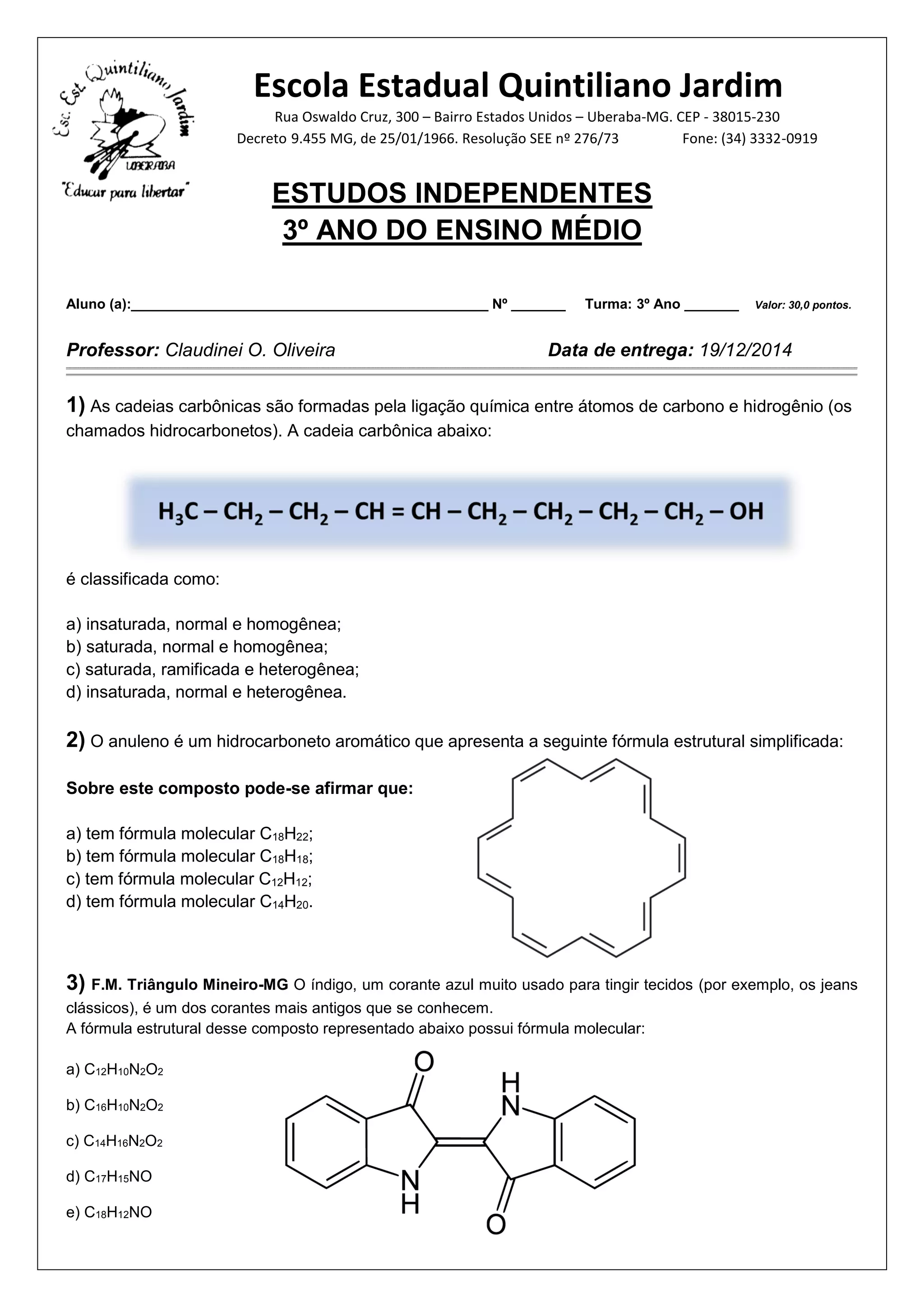Anexar ao trabalho as pesquisas dos temas abaixo, que darão base teórica para resolução das questões estabelecidas: Histórico e propriedades do átomo de carbono; Cadeias carbônicas; Compostos orgânicos oxigenados; Compostos orgânicos nitrogenados; Isomeria constitucional (posição, função, compensação, cadeias); Isomeria configuracional (geométrica e óptica); Reações de substituição, adição, eliminação e oxidação de alcenos, alcadienos e alcinos; Reações de oxirredução.
