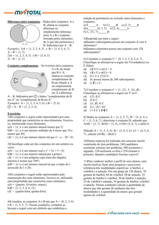 3) Exercícios são fornecidos para aplicar os conceitos aprendidos, como determinar relações entre conjuntos e calcular interseções e uniões.