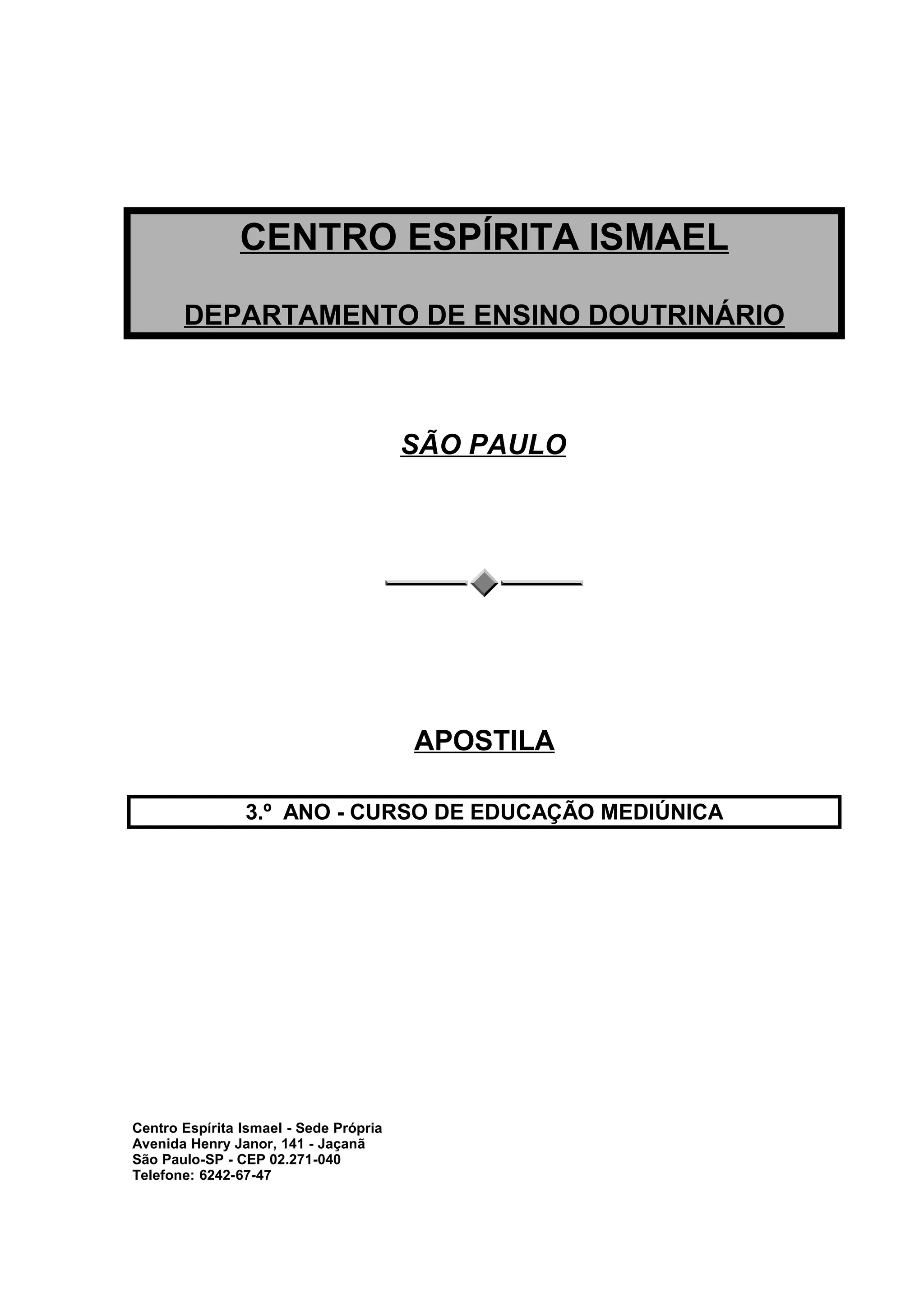 Este documento apresenta o cronograma curricular e os temas abordados no 3o ano do curso de Educação Mediúnica do Centro Espírita Ismael. O cronograma inclui aulas sobre ondas e percepções, pensamento e matéria mental, reflexos, magnetismo, hipnotismo e outros temas relacionados à mediunidade.