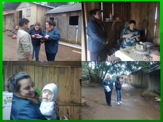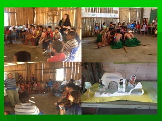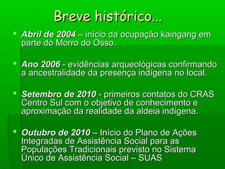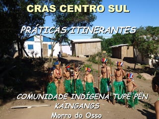 O documento descreve as ações de um CRAS com a comunidade indígena Kaingang no Morro do Osso desde 2010, incluindo cadastramento em programas sociais, entrega de cestas básicas, apoio em documentação, moradia e educação. Também discute desafios como ampliar interlocução intergovernamental e autossustentabilidade da comunidade.