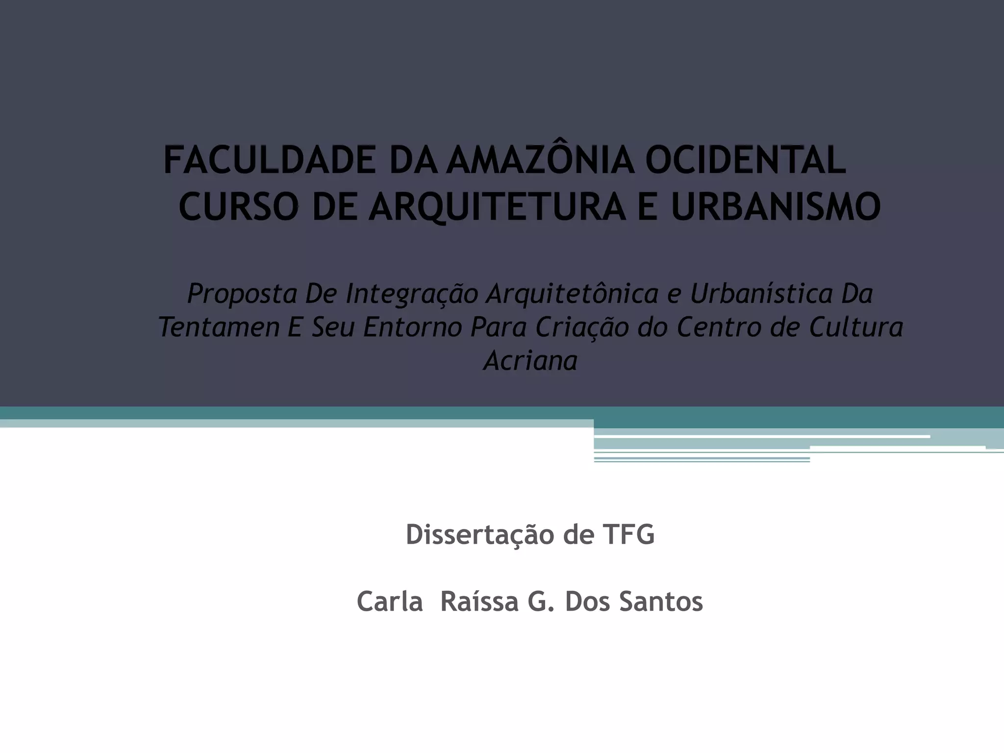 A proposta visa integrar arquitetonicamente a Tentamen e seu entorno na cidade de Rio Branco, AC, criando um centro de cultura acriana. A Tentamen foi construída em 1924 como clube recreativo e o Cine Teatro Recreio foi criado em 1928, fazendo parte da vida cultural local. O projeto pretende restaurar esses espaços e criar uma galeria de arte, cafeteria e áreas de convivência, preservando a memória desses locais e promovendo a cultura.