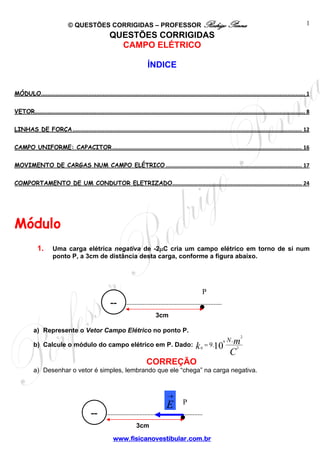 O documento fornece resumos de questões sobre campo elétrico, incluindo: