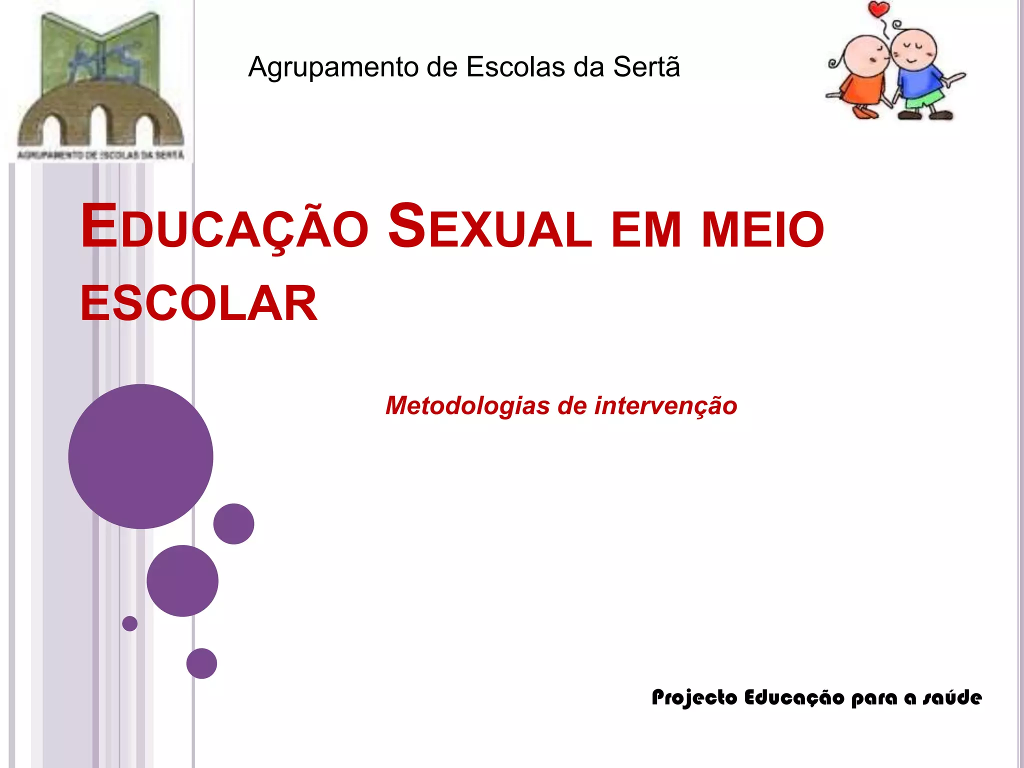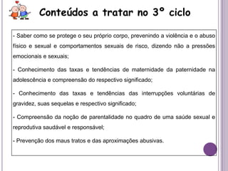 Este documento discute a educação sexual em escolas portuguesas. Ele define sexualidade segundo a OMS, destaca a legislação relevante e a carga horária de 12 horas dedicada a educação sexual no 3o ciclo. As escolas devem elaborar projetos curriculares de turma para educação sexual de acordo com as normas, e todos têm direito a educação e informação sobre sua vida sexual e reprodutiva.
