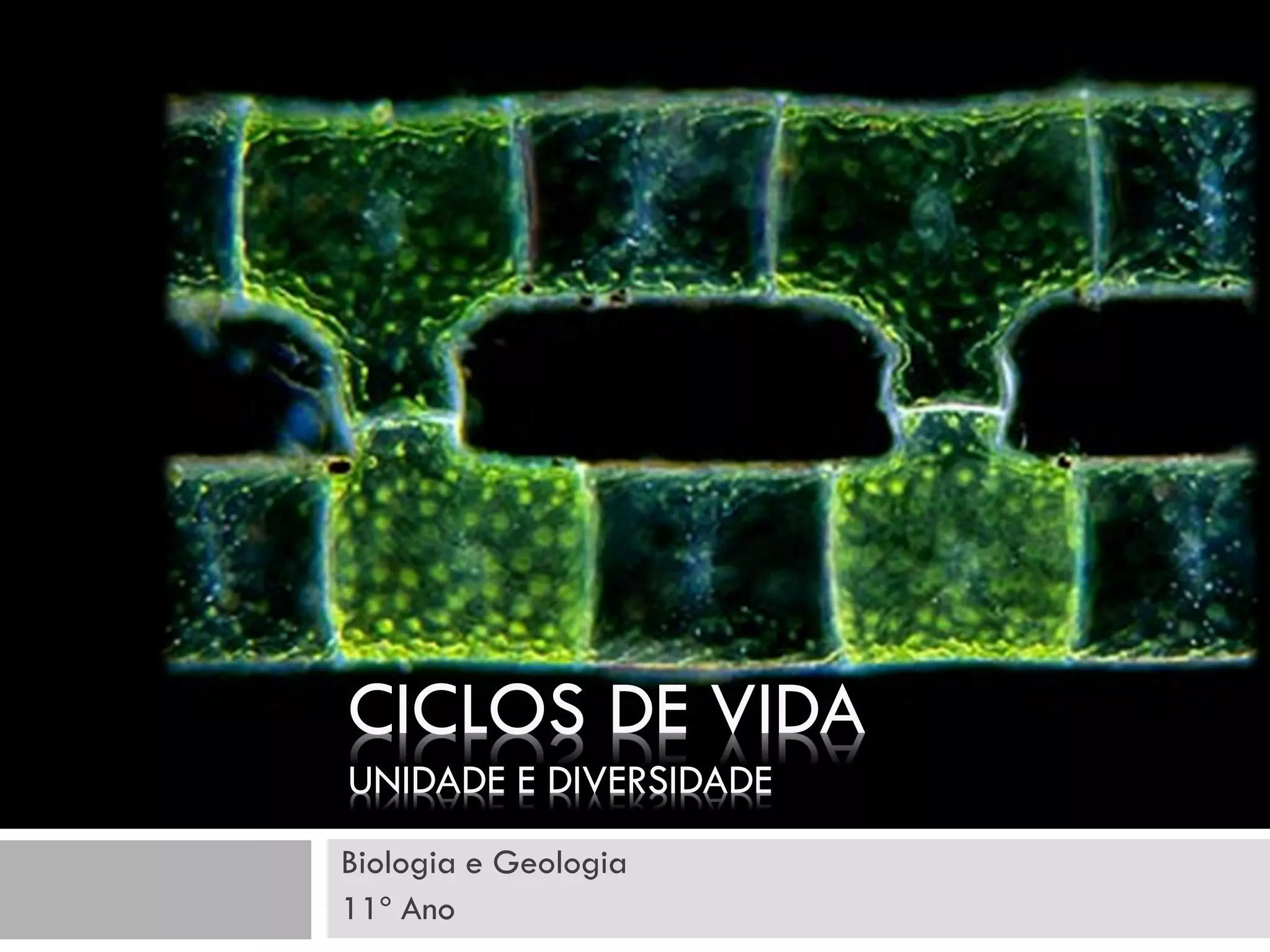 O documento descreve três tipos de ciclos de vida - haplonte, diplonte e haplodiplonte - e fornece exemplos de cada um. Também discute como as condições ambientais influenciam o modo de reprodução e como a atividade humana pode alterar os ciclos de vida através da poluição, perda de habitat e mudanças climáticas.