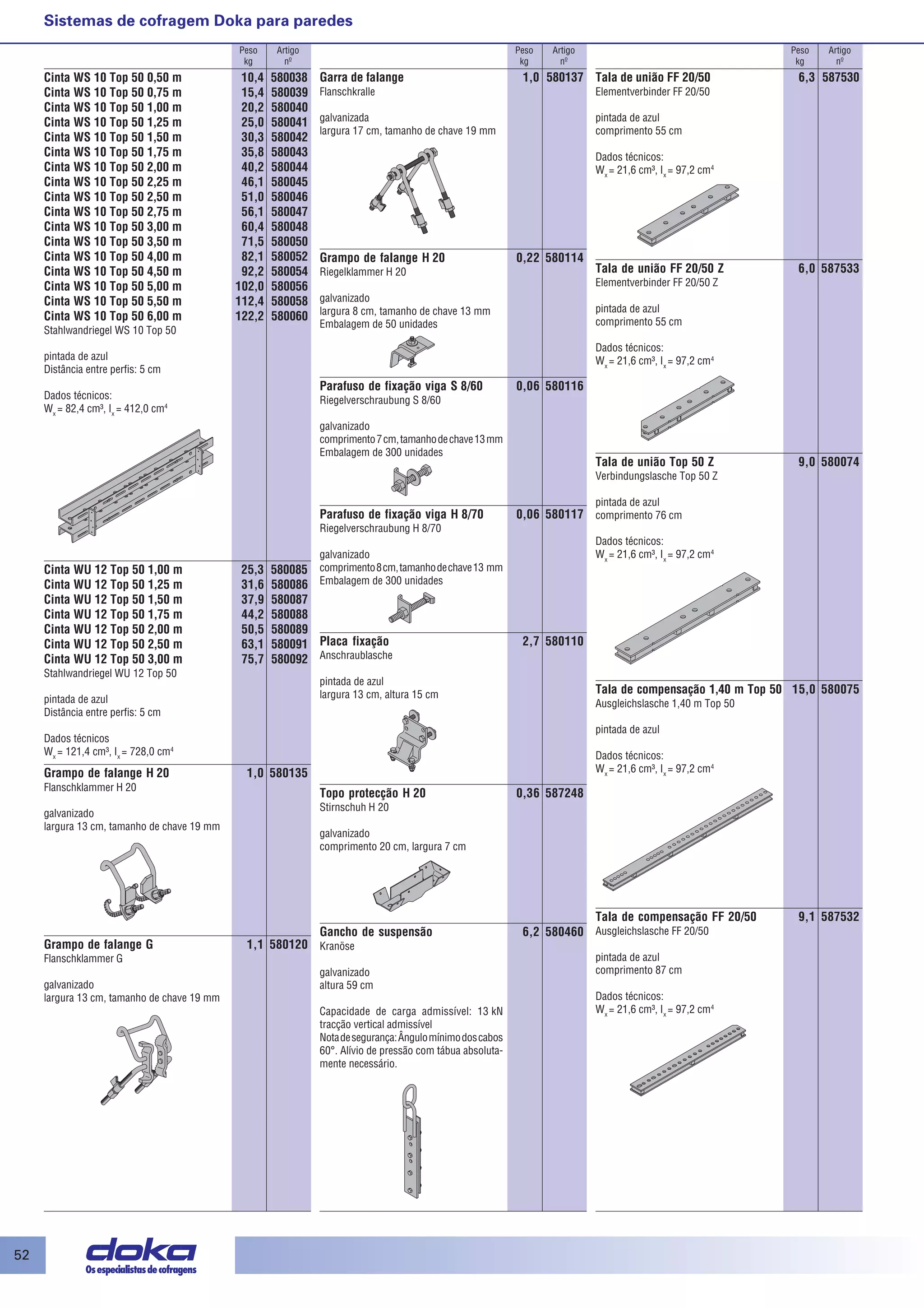 O documento lista uma variedade de componentes e especificações técnicas para sistemas de cofragem da Doka, incluindo cintas, grampos e elementos de ancoragem, com detalhes sobre peso, tamanho e configuração. Cada item é apresentado com informações específicas, como peso em kg e distância entre perfis, além de instruções de segurança relevantes. O foco principal é na qualidade e segurança dos materiais utilizados na construção.