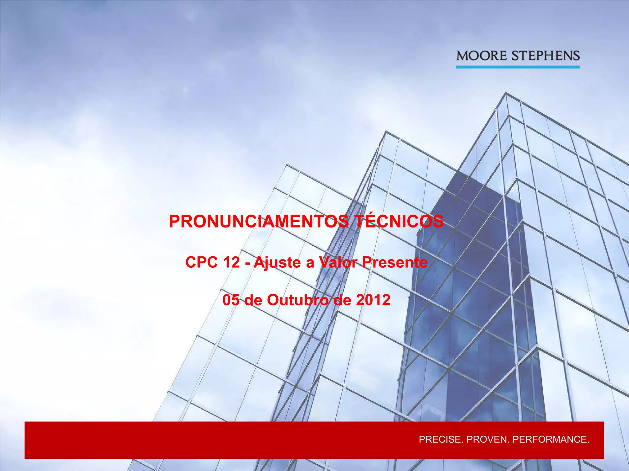 - O documento discute as diretrizes para ajuste a valor presente de acordo com o CPC 12, definindo seus objetivos, escopo e métodos de mensuração, como taxas de desconto e divulgação de premissas.