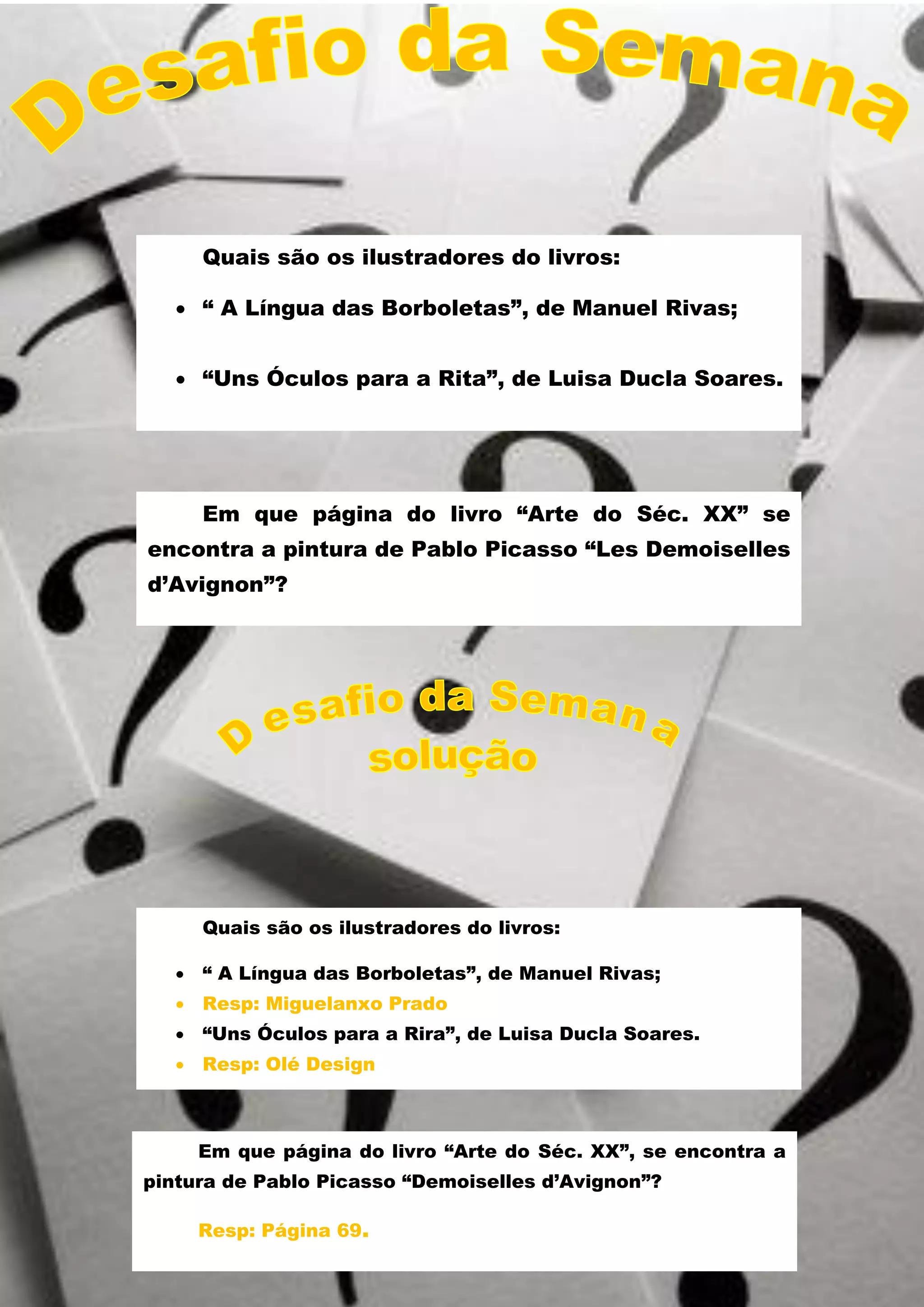 O documento lista dois livros ilustrados, seus autores e ilustradores: "A Língua das Borboletas" por Manuel Rivas, ilustrado por Miguelanxo Prado; e "Uns Óculos para a Rita" por Luisa Ducla Soares, ilustrado por Olé Design. Também pergunta e responde em que página do livro "Arte do Séc. XX" se encontra a pintura "Les Demoiselles d'Avignon" de Pablo Picasso, na página 69.