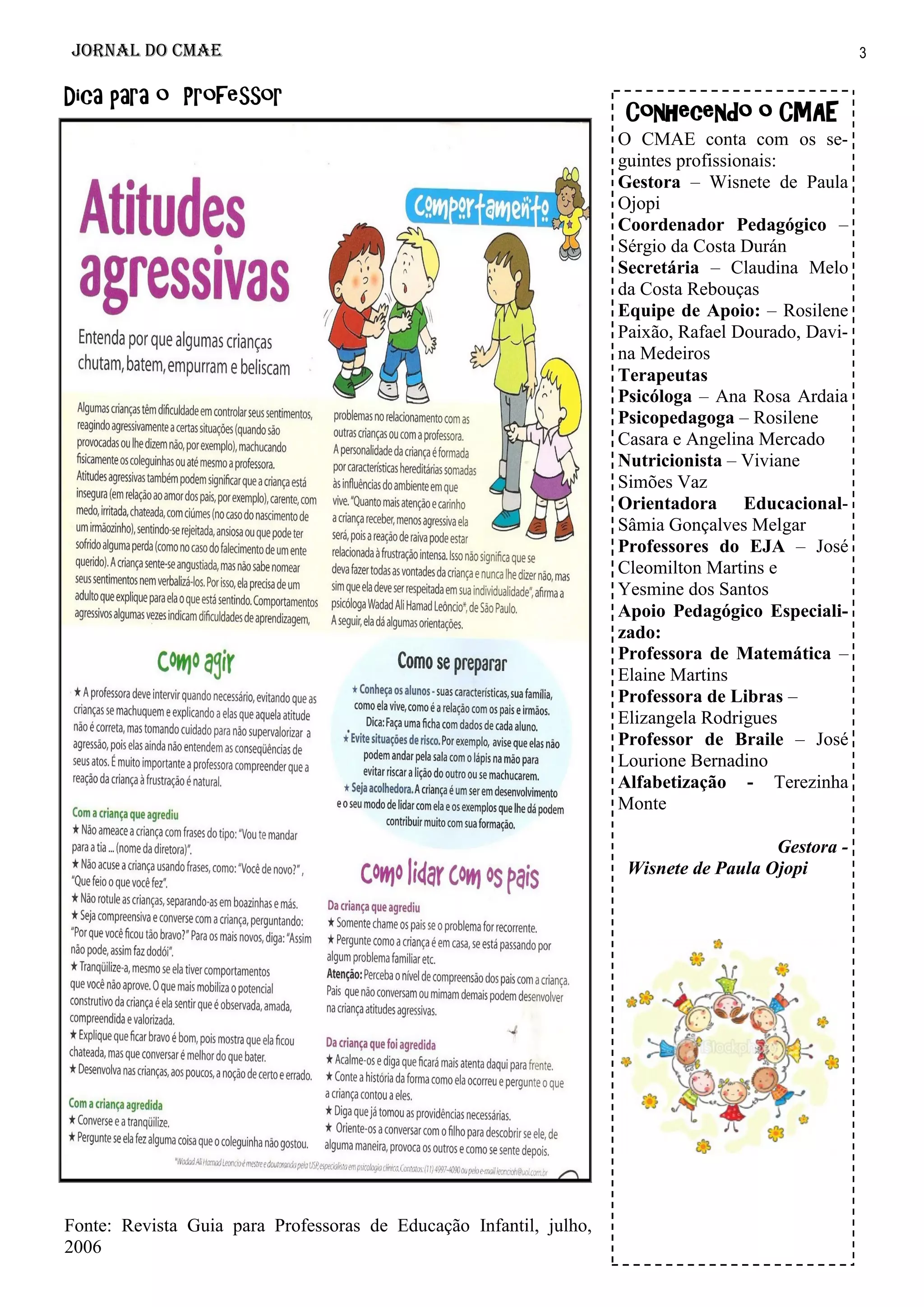 O documento descreve os profissionais que trabalham no CMAE, incluindo a gestora, coordenador pedagógico, secretária, terapeutas, professores e equipe de apoio. Ele também explica o papel da psicopedagoga em compreender os processos de aprendizagem e possíveis dificuldades.