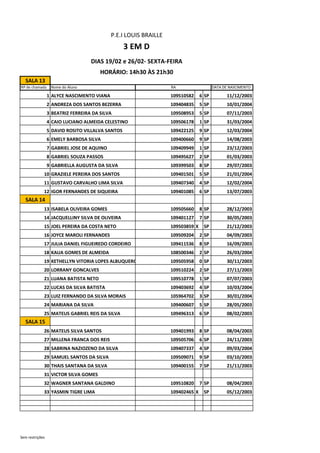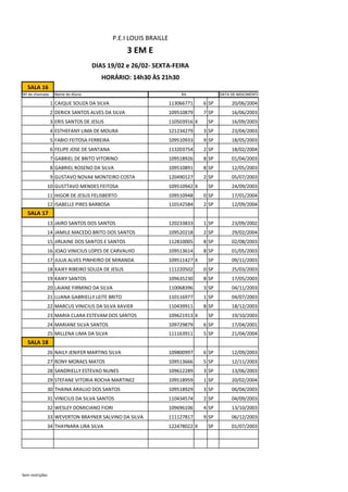 Este documento contém três listas de alunos matriculados em três salas de aula diferentes. Cada lista contém o número de chamada, nome, data de nascimento e estado civil de cada aluno. As listas fornecem informações básicas sobre 33 alunos em cada uma das três salas.