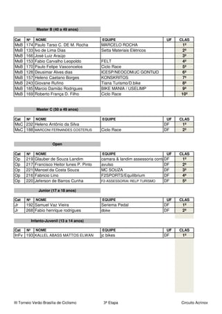 Este documento fornece os resultados da 3a etapa do Circuito Acrinox do 3o Torneio Verão Brasília de Ciclismo realizado em 13 de março. Ele lista os nomes, equipes e classificações dos ciclistas em várias categorias como Elite Masculino, Sub 23, Master A, B e C, Open, Junior, Infanto-Juvenil e Sub 30.