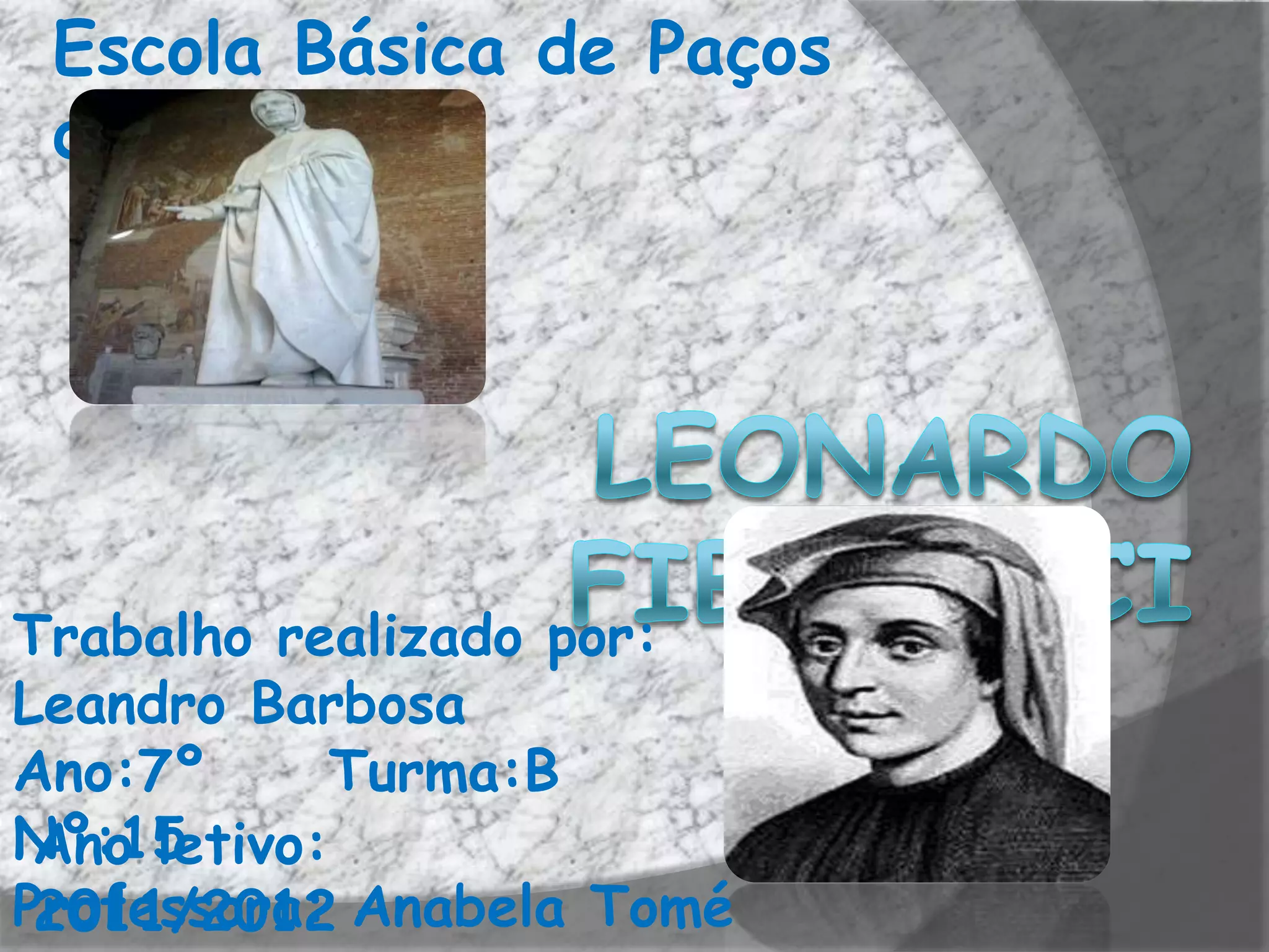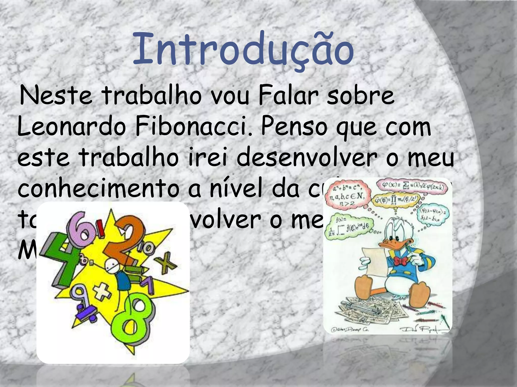 Este documento resume um trabalho sobre Leonardo Fibonacci realizado por um aluno do 7o ano. O trabalho discute a vida e contribuições de Fibonacci, incluindo a introdução da sequência de Fibonacci e suas relações com a arte, literatura, geometria e cinema.