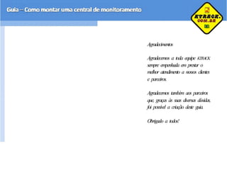 O documento fornece um guia sobre como montar uma central de monitoramento, descrevendo o mercado de rastreamento veicular, os tipos de clientes, aplicações, equipamentos e requisitos necessários.