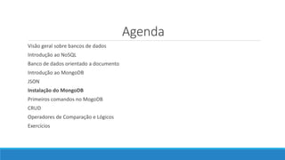 O documento apresenta as etapas para instalação do MongoDB, incluindo baixar o software a partir do site oficial, criar pastas para armazenar as bases de dados no disco C, com nomes "data" e "db".