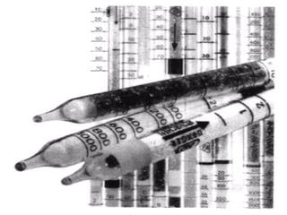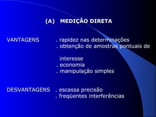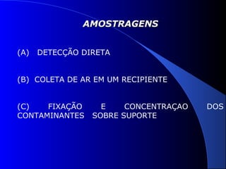 O documento discute diferentes métodos de amostragem de contaminantes no ar, incluindo: (1) detecção direta, que fornece resultados rápidos mas menos precisos; (2) coleta de amostras de ar em recipientes para análise posterior, permitindo maior precisão; e (3) fixação dos contaminantes em suportes para concentração e medição.