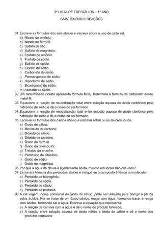 Este documento apresenta 13 exercícios sobre sais, óxidos e reações químicas. Os exercícios abordam tópicos como fórmulas químicas de sais e óxidos, reações de neutralização, efeito estufa, emissão de gases e tipos de reações químicas.