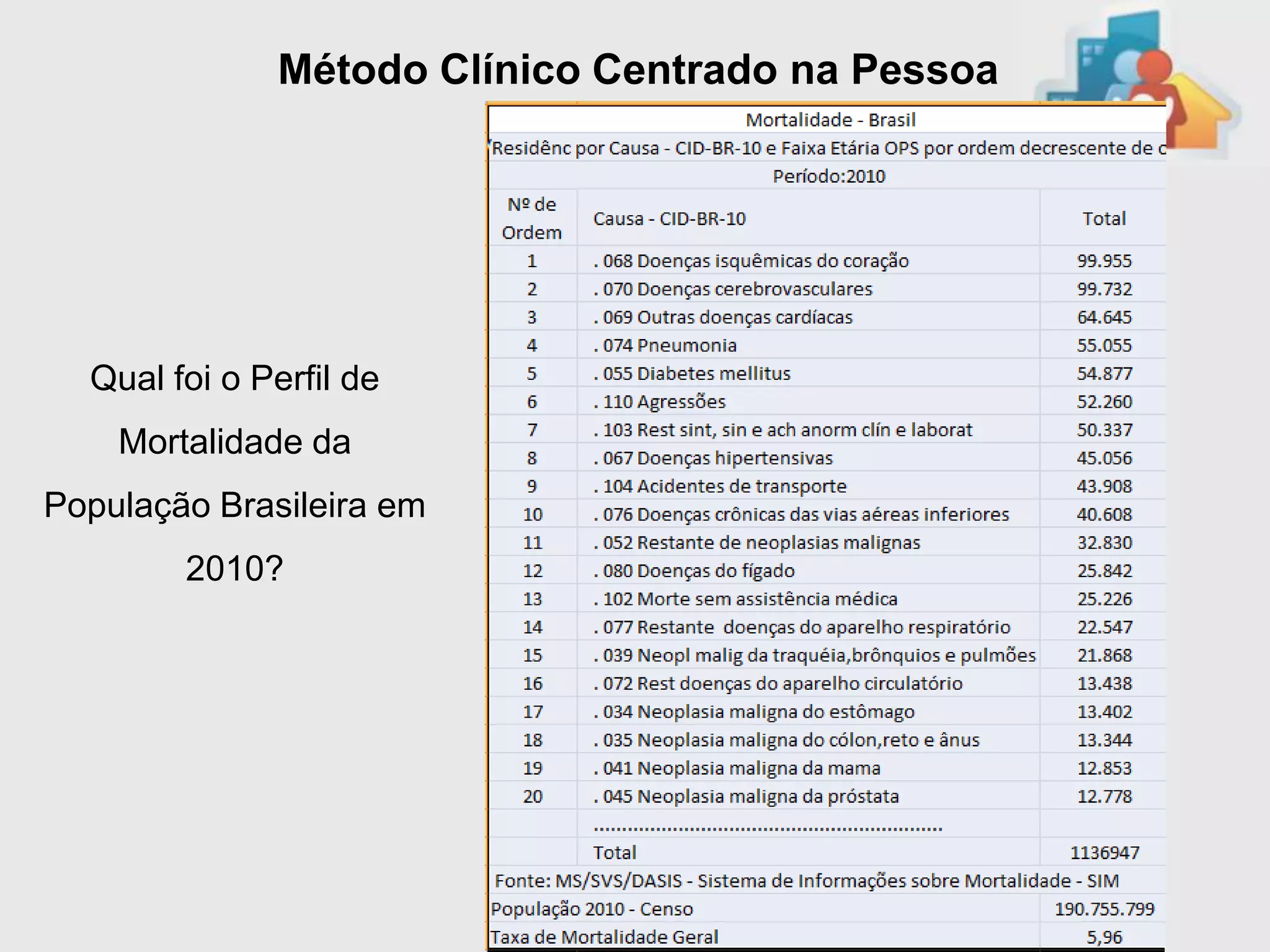 O documento discute o método clínico centrado na pessoa. Aborda princípios como a exploração da experiência do paciente com a doença, o entendimento global da pessoa, e a busca de objetivos comuns entre médico e paciente. Também trata da incorporação de medidas de prevenção e promoção da saúde e da melhoria da relação médico-paciente.