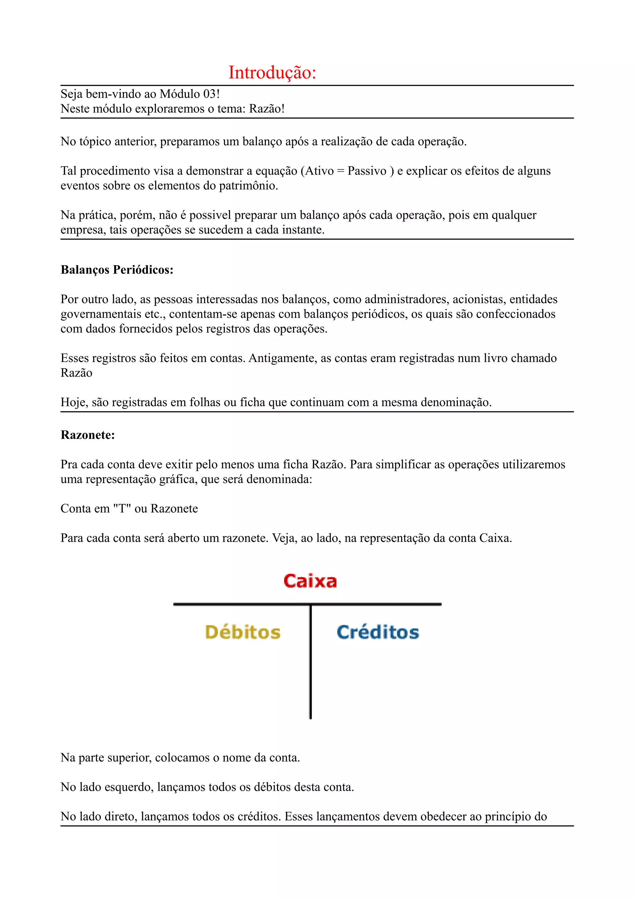 Este documento introduz o conceito de razão e como ele é usado para registrar transações contábeis em contas. Explica que cada conta tem uma folha de razão onde débitos são registrados no lado esquerdo e créditos no lado direito. Também descreve como o princípio das partidas dobradas significa que cada débito deve ter um crédito correspondente de mesmo valor para manter o equilíbrio do balanço patrimonial.