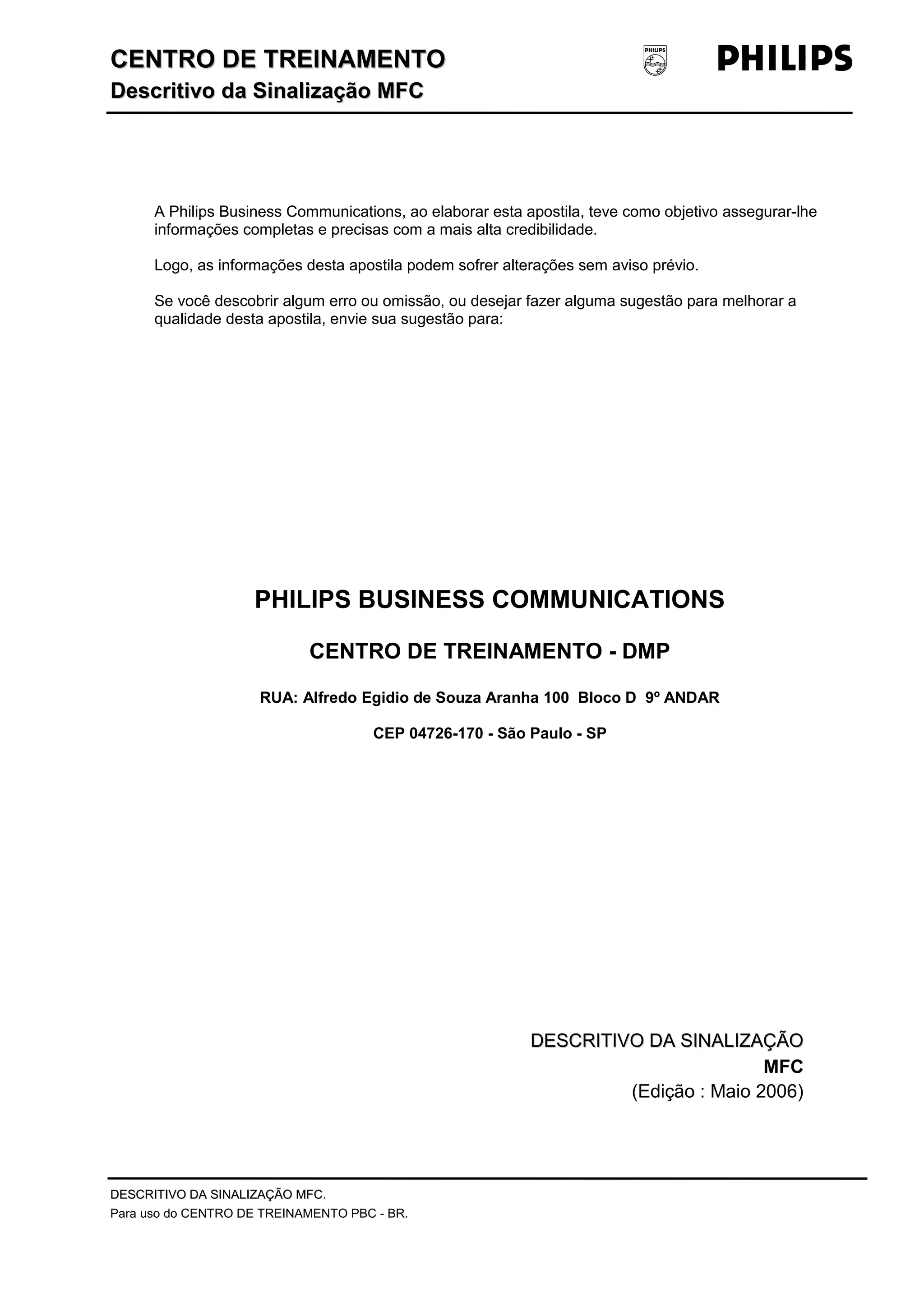 Este documento descreve a sinalização multifrequencial compelida (MFC), usada na rede telefônica brasileira. A MFC usa pares de tons de frequência para transmitir sinais digitais entre centrais telefônicas durante o estabelecimento de chamadas. É composta por dois grupos de 15 sinais transmitidos em diferentes bandas de frequência para indicar dígitos numéricos, controle de chamadas e outros comandos. O documento explica como funciona um ciclo completo de sinalização MFC durante uma chamada.