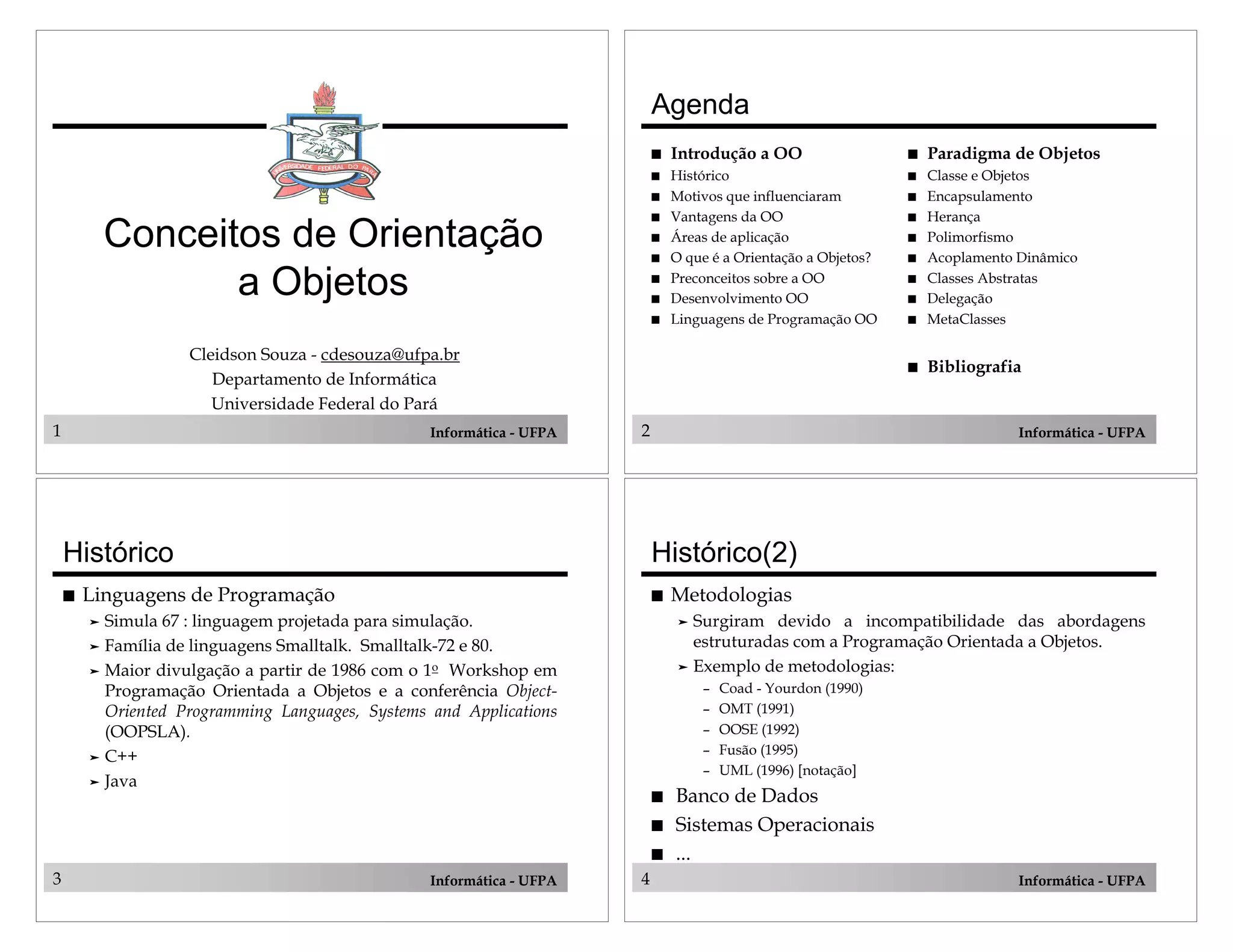 O documento apresenta uma introdução aos conceitos e histórico da orientação a objetos, incluindo definições de classes, objetos e outros princípios. Também discute vantagens da abordagem orientada a objetos, preconceitos comuns, desenvolvimento orientado a objetos e linguagens de programação orientadas a objetos como C++ e Java.