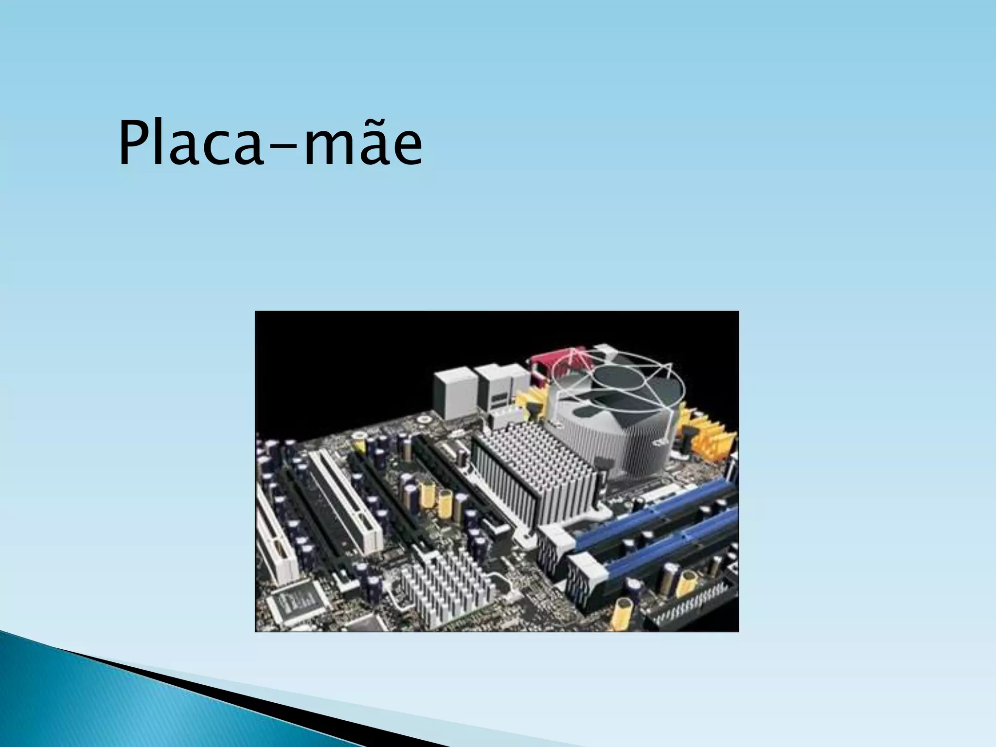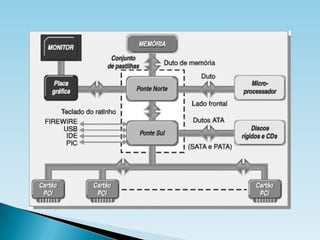 A placa-mãe é o componente central do computador, interligando todos os dispositivos e controlando a comunicação entre eles. Ela contém slots para processadores, memória e interfaces de entrada e saída, como portas USB e série, além de chipsets que gerenciam a transferência de dados. Com o tempo, as tecnologias de conexão evoluíram, com a substituição de portas tradicionais por USB e outras configurações de barramento para maior eficiência.