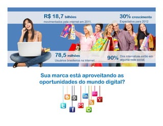 O documento oferece serviços de marketing digital para empresas que desejam aumentar sua presença na internet em 2011 e 2012. Inclui estratégias como gestão de redes sociais, criação de lojas virtuais e campanhas promocionais. A empresa também proporciona kits de divulgação e integração com redes sociais sem taxas de desenvolvimento.