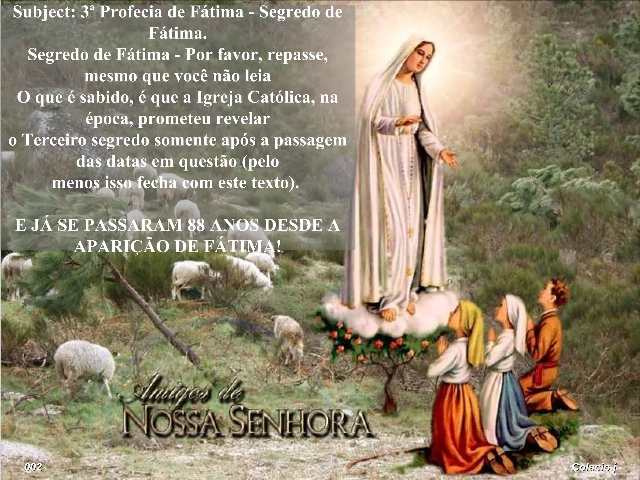 O documento resume o terceiro segredo de Fátima, que prevê grandes catástrofes naturais e conflitos entre 1950-2000, incluindo uma guerra nuclear de 3 dias que destruiria metade da humanidade. A mensagem pede arrependimento e oração para evitar os castigos divinos profetizados.