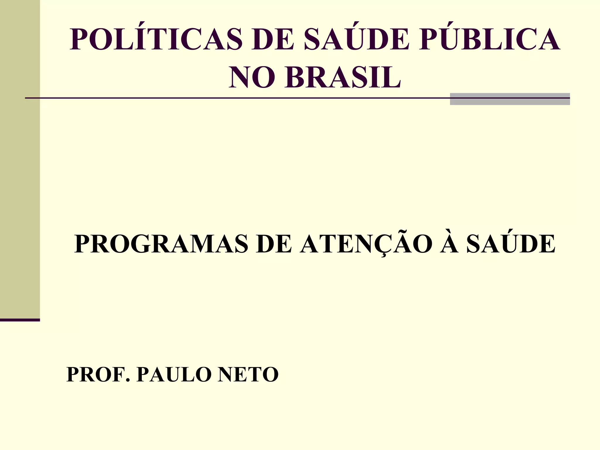 O documento discute os programas de saúde pública no Brasil, incluindo o Programa de Saúde da Família. Ele descreve os principais programas do Ministério da Saúde voltados para diferentes grupos como crianças, adolescentes, adultos e idosos. Também fornece estatísticas sobre a cobertura e financiamento do Programa de Saúde da Família entre 1994-2007.