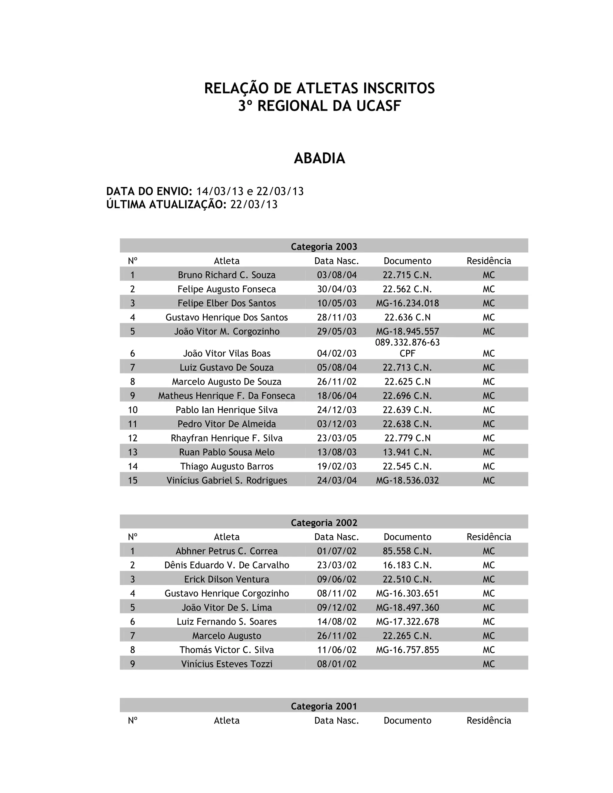 O documento lista os nomes, datas de nascimento e documentos de identidade de atletas em várias categorias de idade de um clube esportivo. As informações estão organizadas por ano de nascimento dos atletas, começando pelas categorias mais velhas até as mais novas.